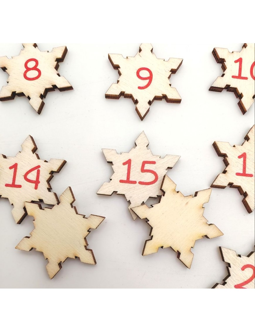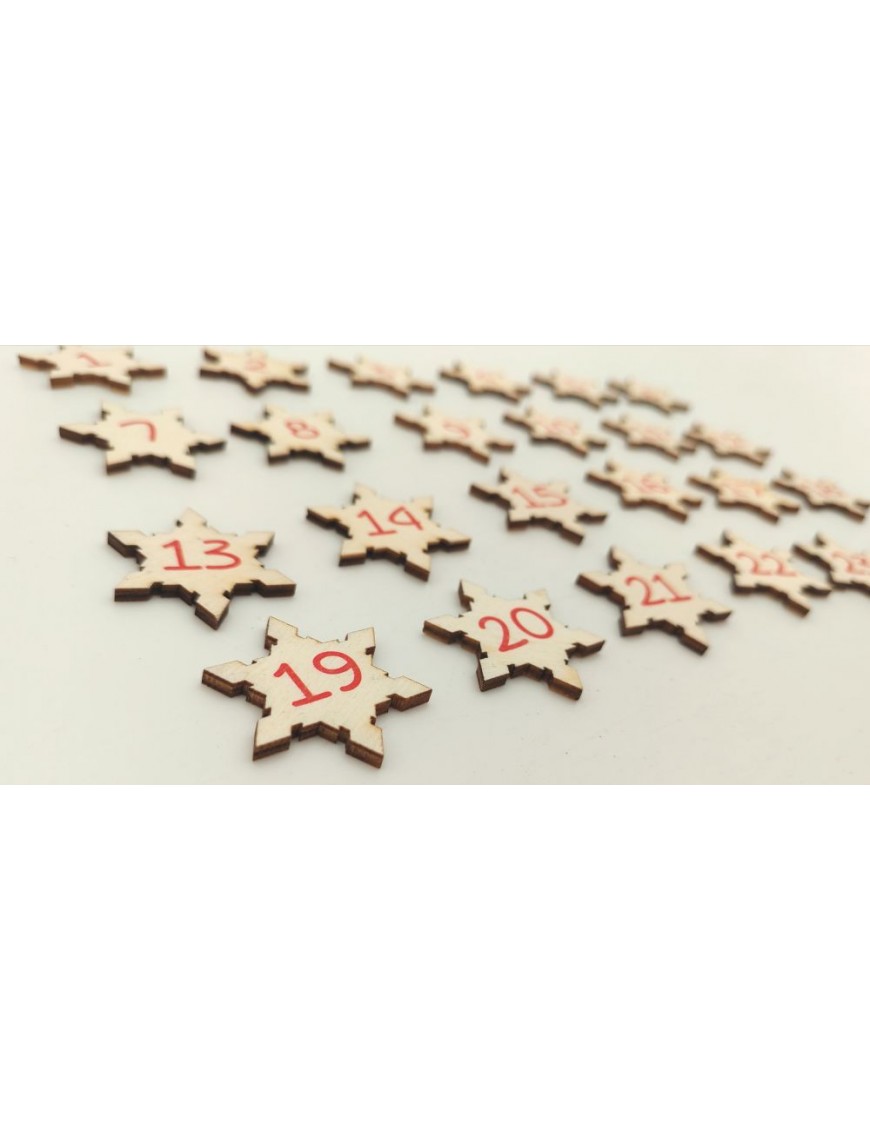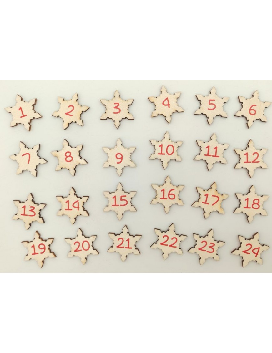 Adventi kalendáriumhoz való, fából készült csillagok piros számokkal.