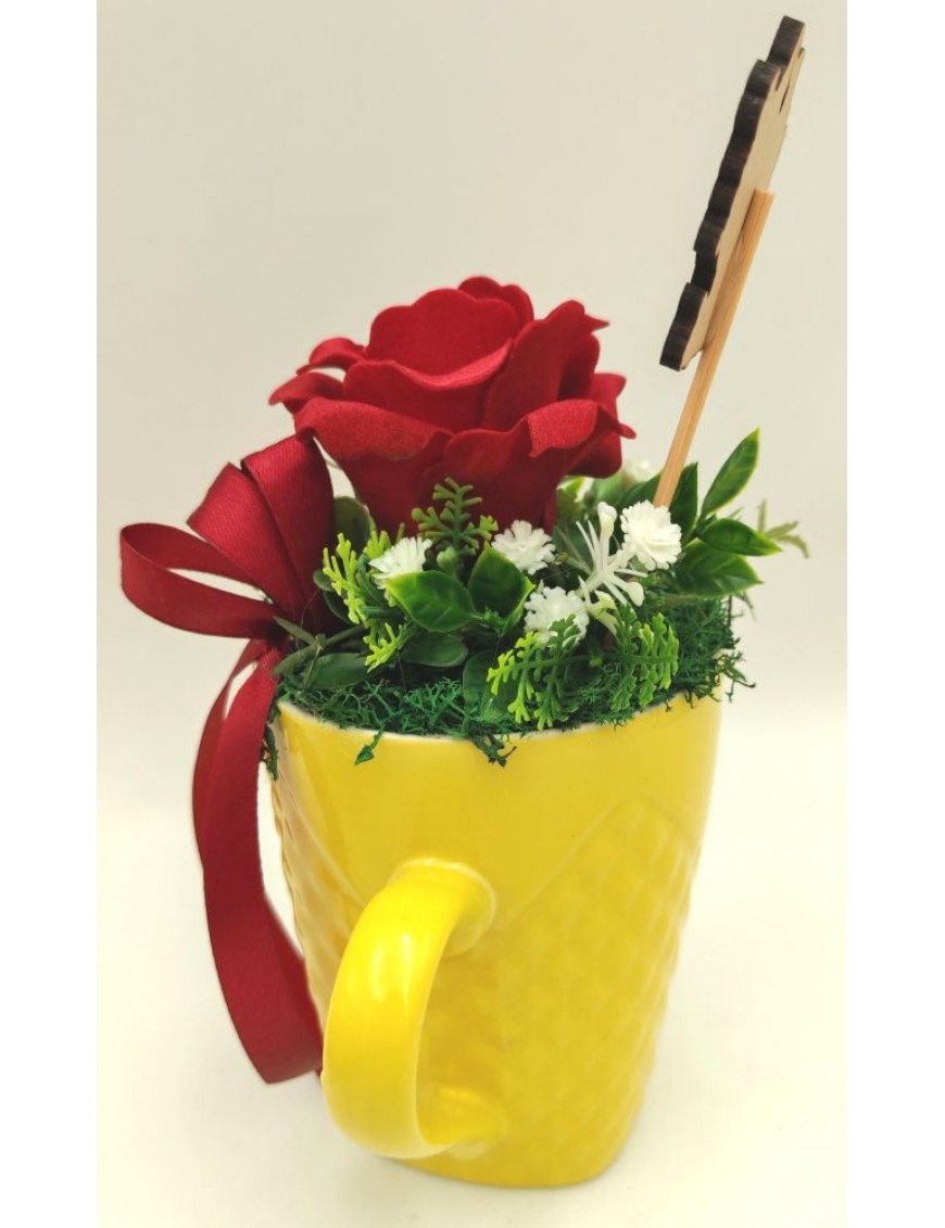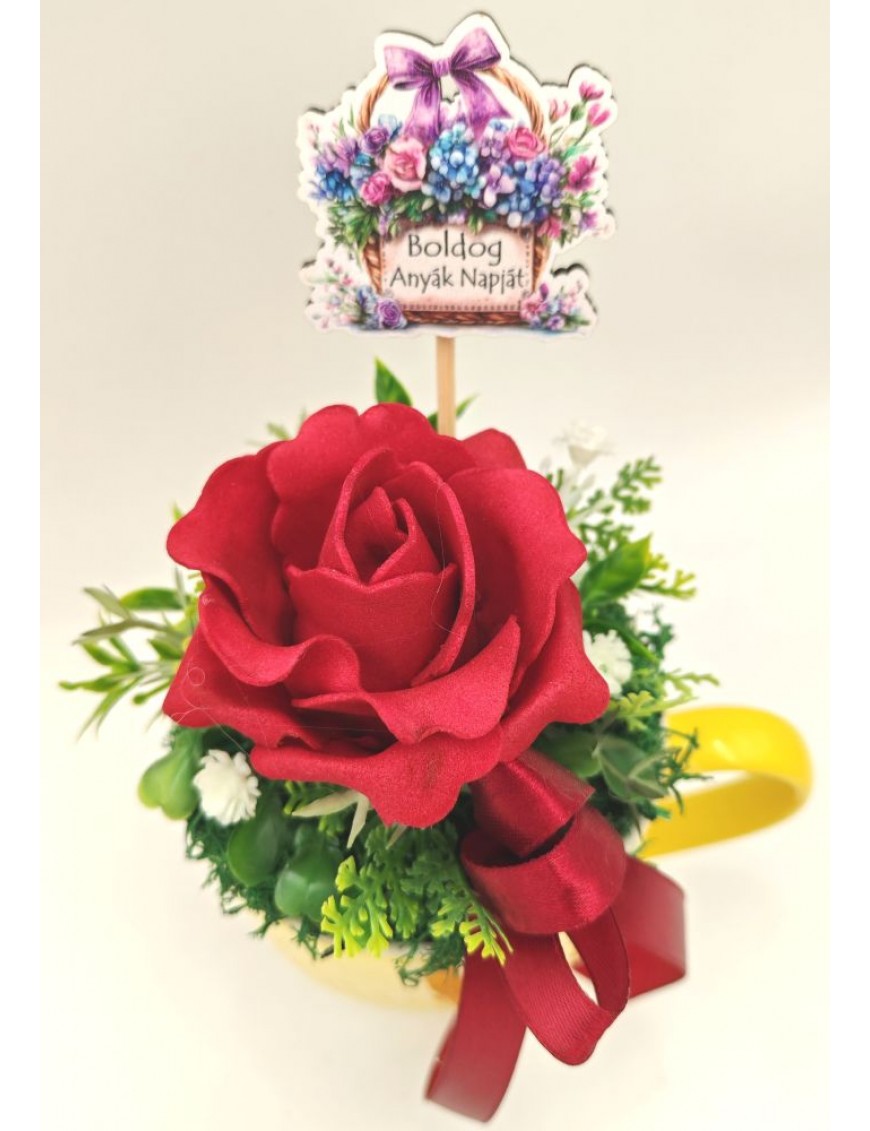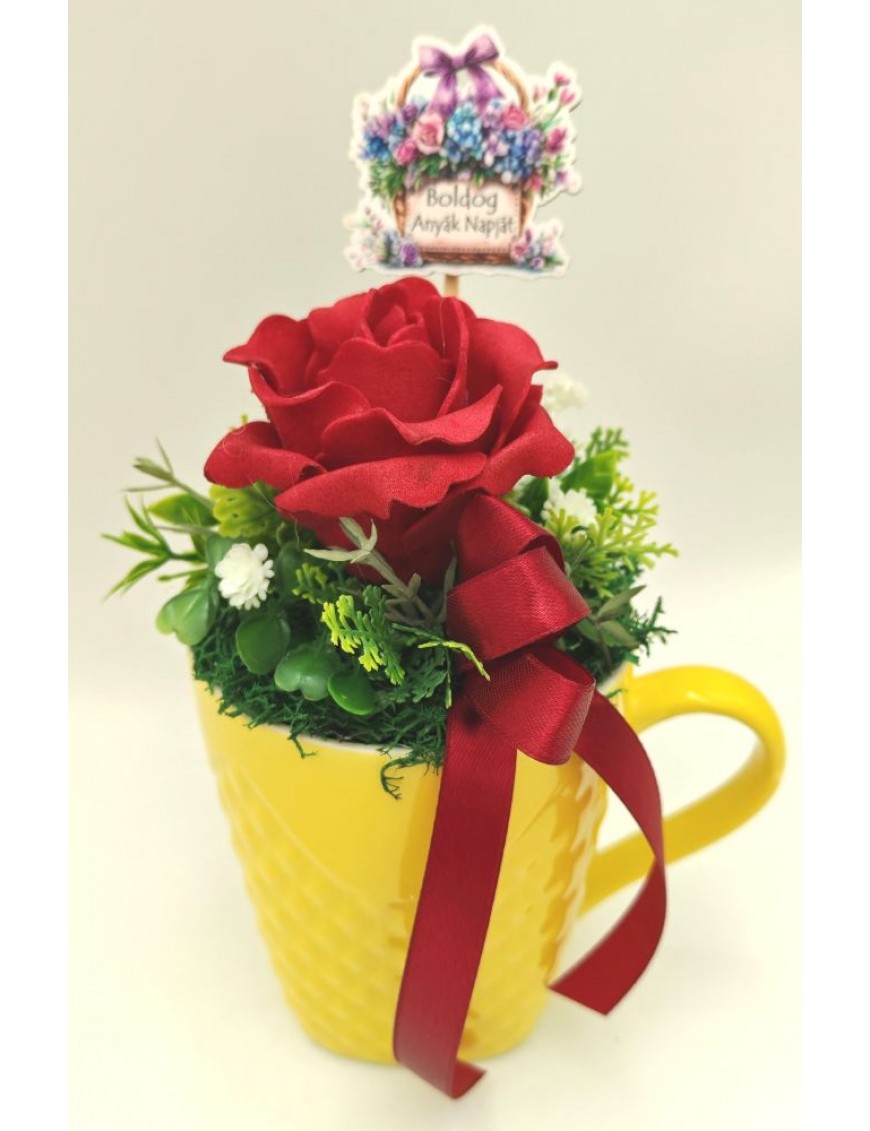 Sárga kerámia bögre bordó színű polifoam rózsával, beszúrós táblával: Boldog Anyák Napját.