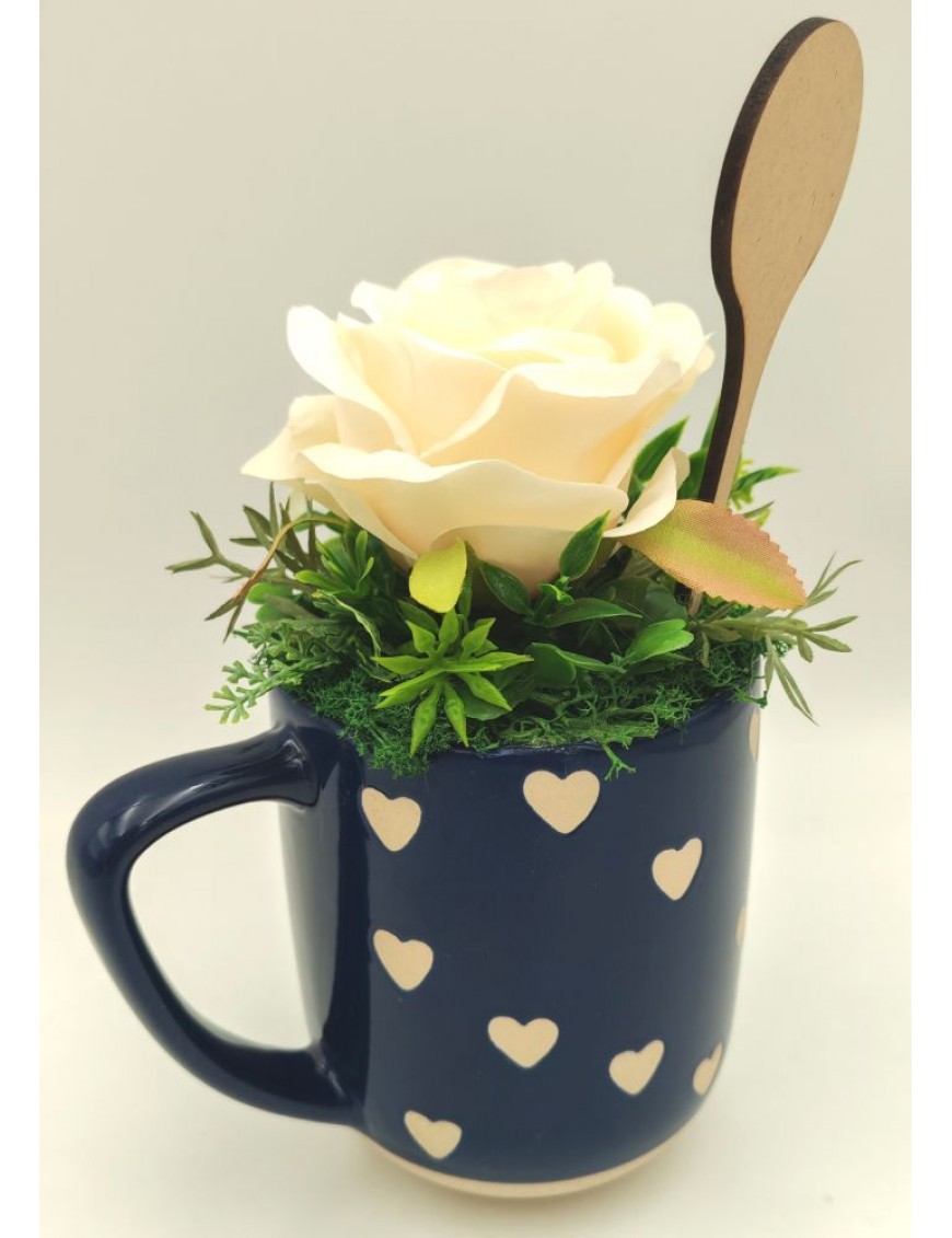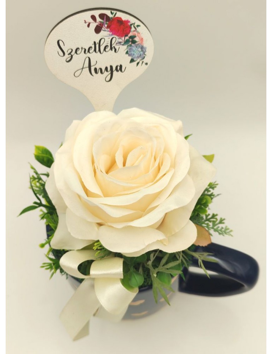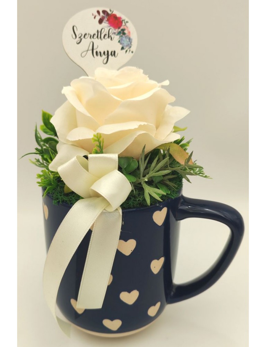 Sötétkék alapon fehér szíves kerámia bögre krémszínű rózsával díszítve, táblával: Szeretlek Anya.