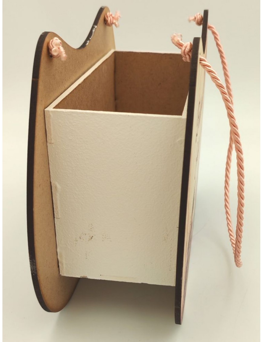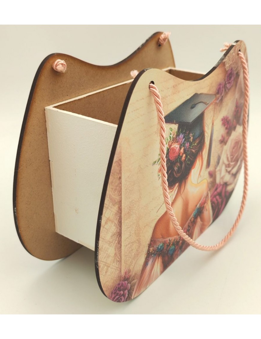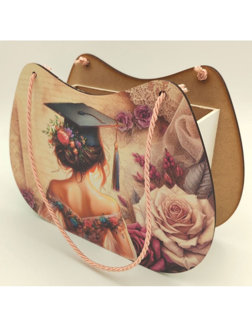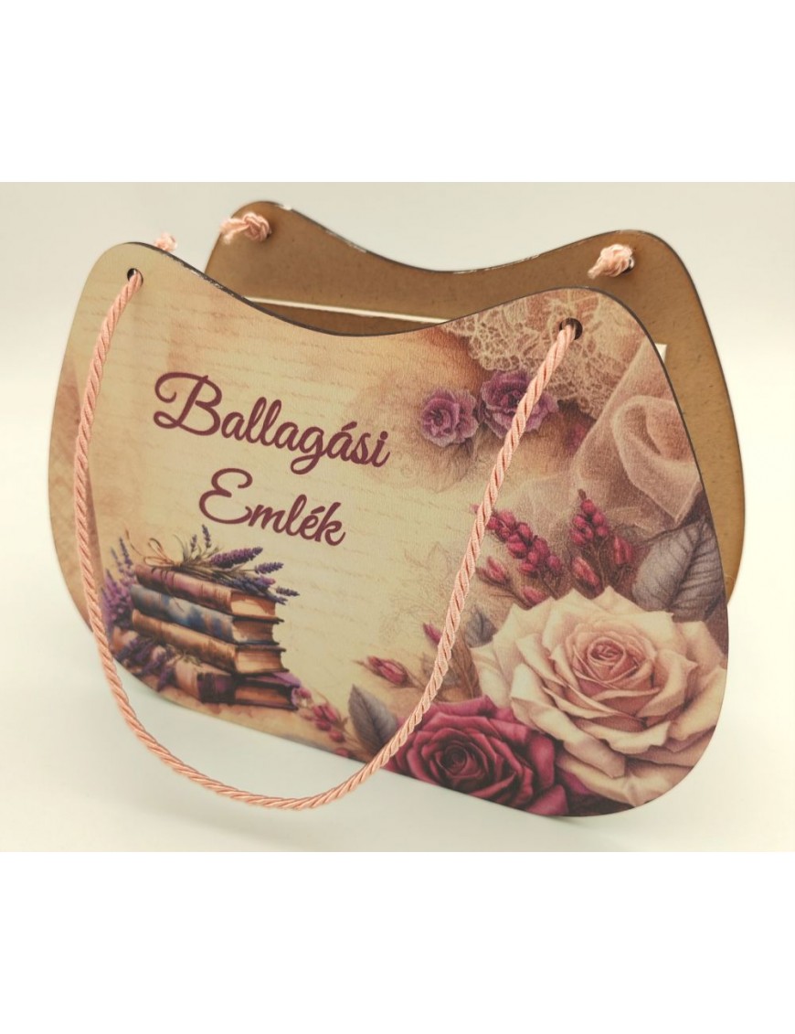 Fából készült, nyomtatott ballagó táska lányos mintával.