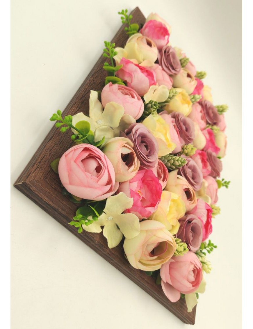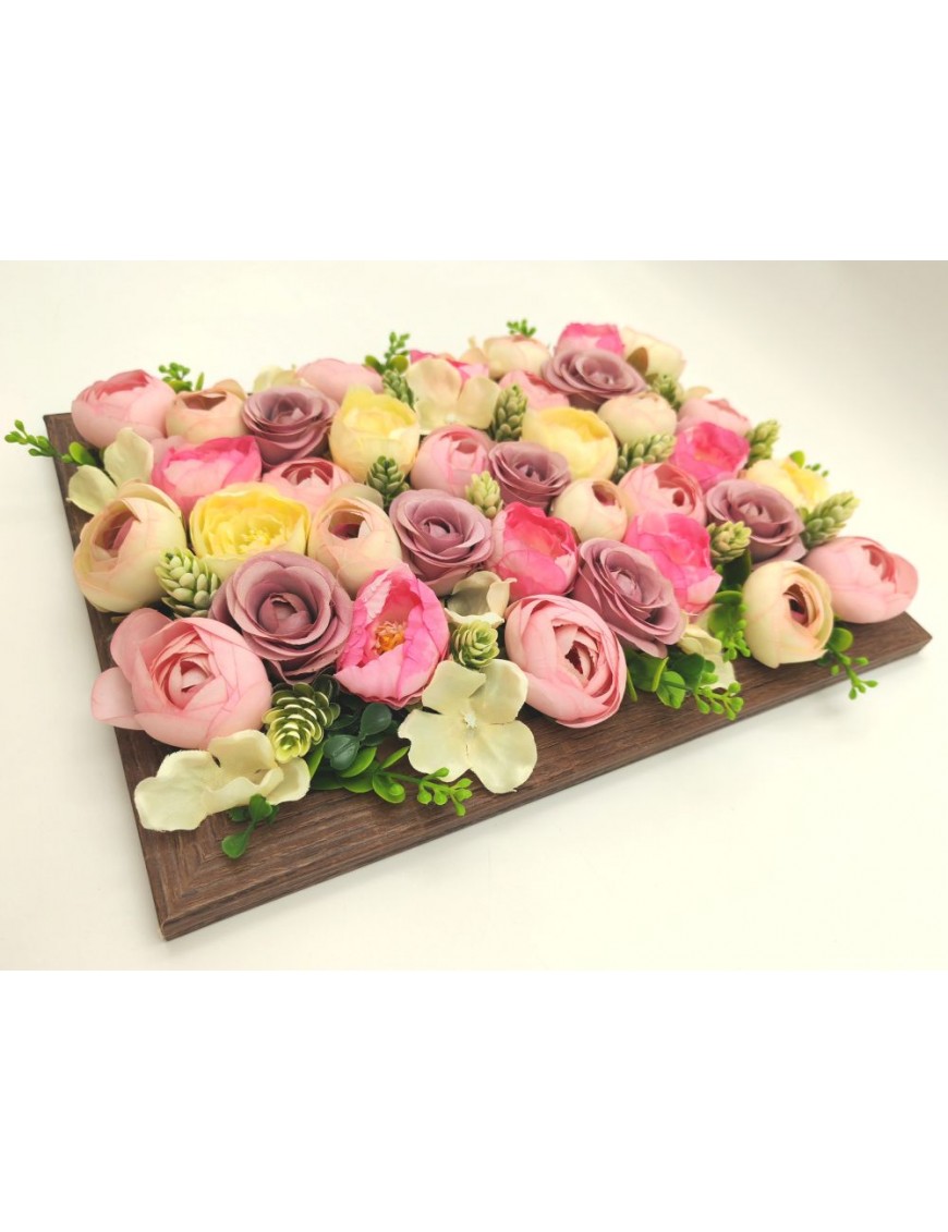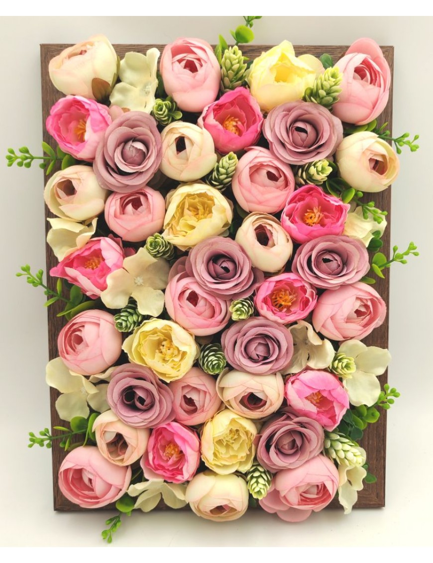 Barna képkeretbe készített virágszőnyeg lila, rózsaszín, krémszínű selyemvirágokkal.