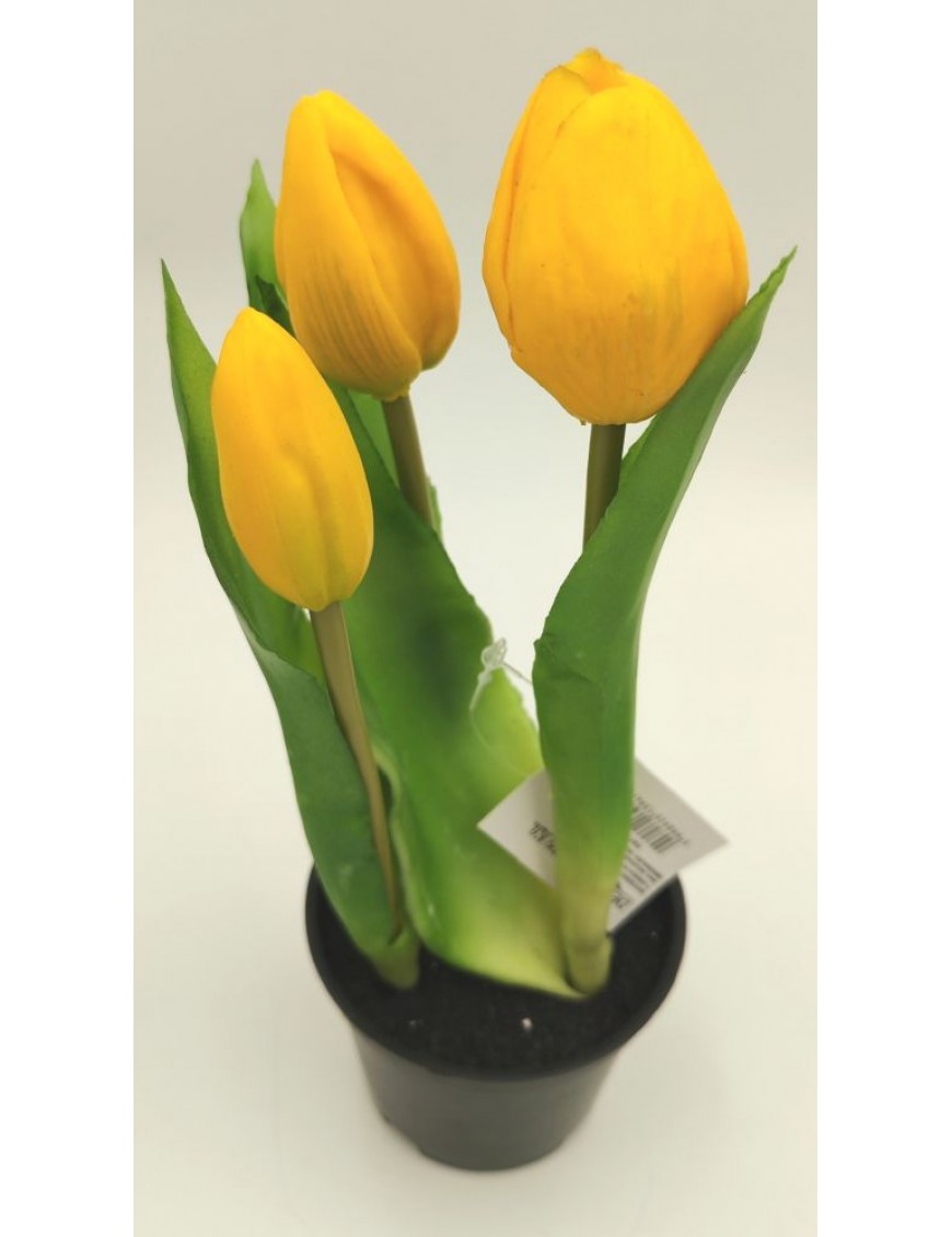 Műanyag cserépbe rögzített, élő hatású gumi tulipán többféle színben.