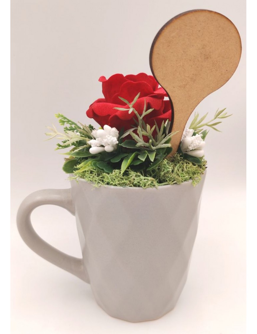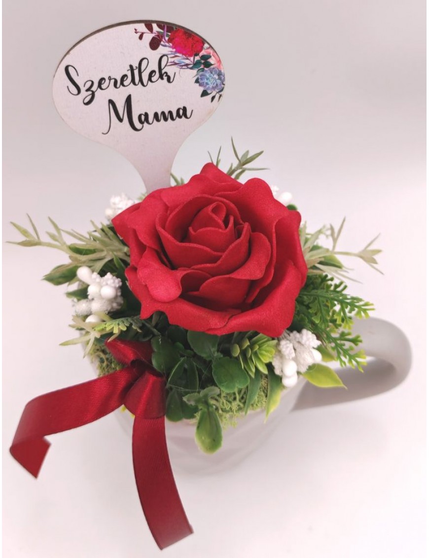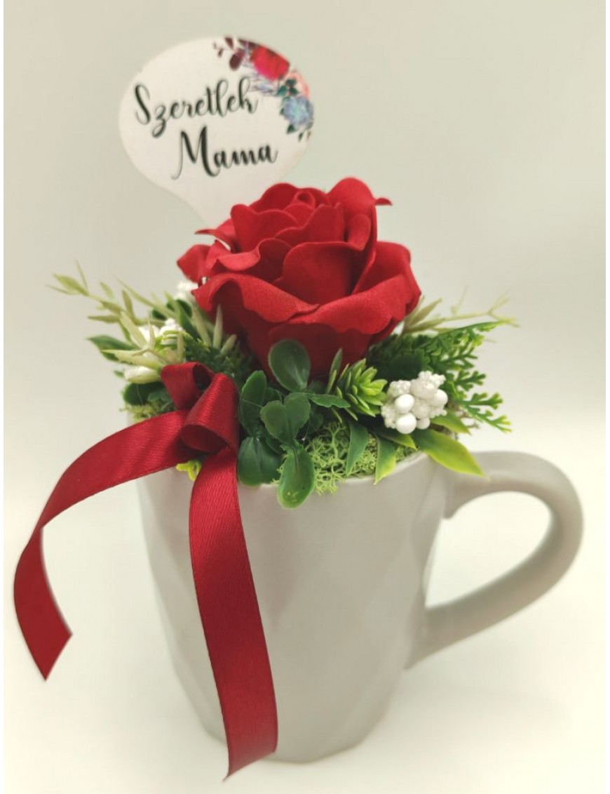 Szürke kerámia bögre bordó színű polifoam rózsával, beszúrós táblával: Szeretlek Mama.