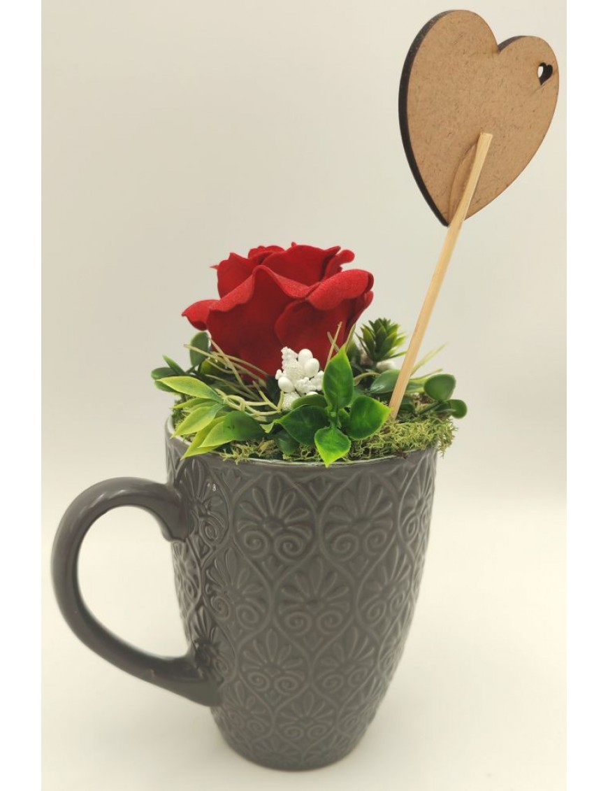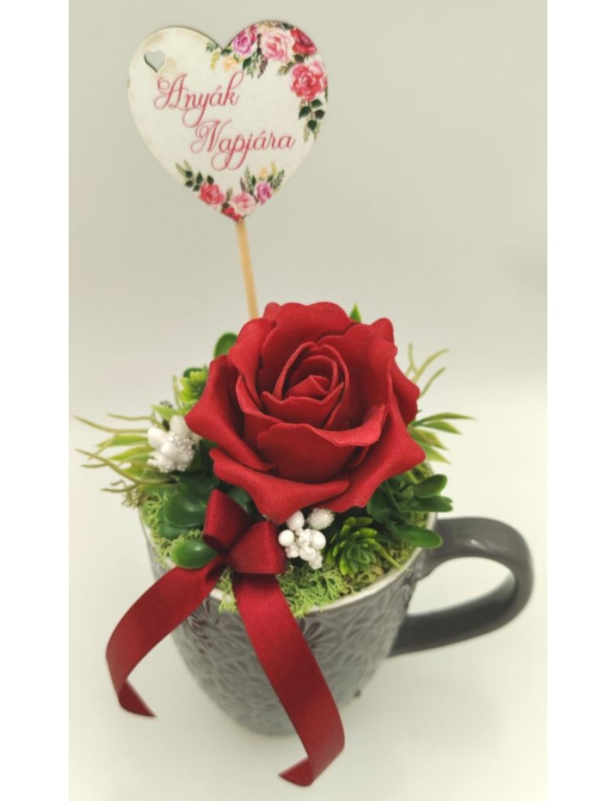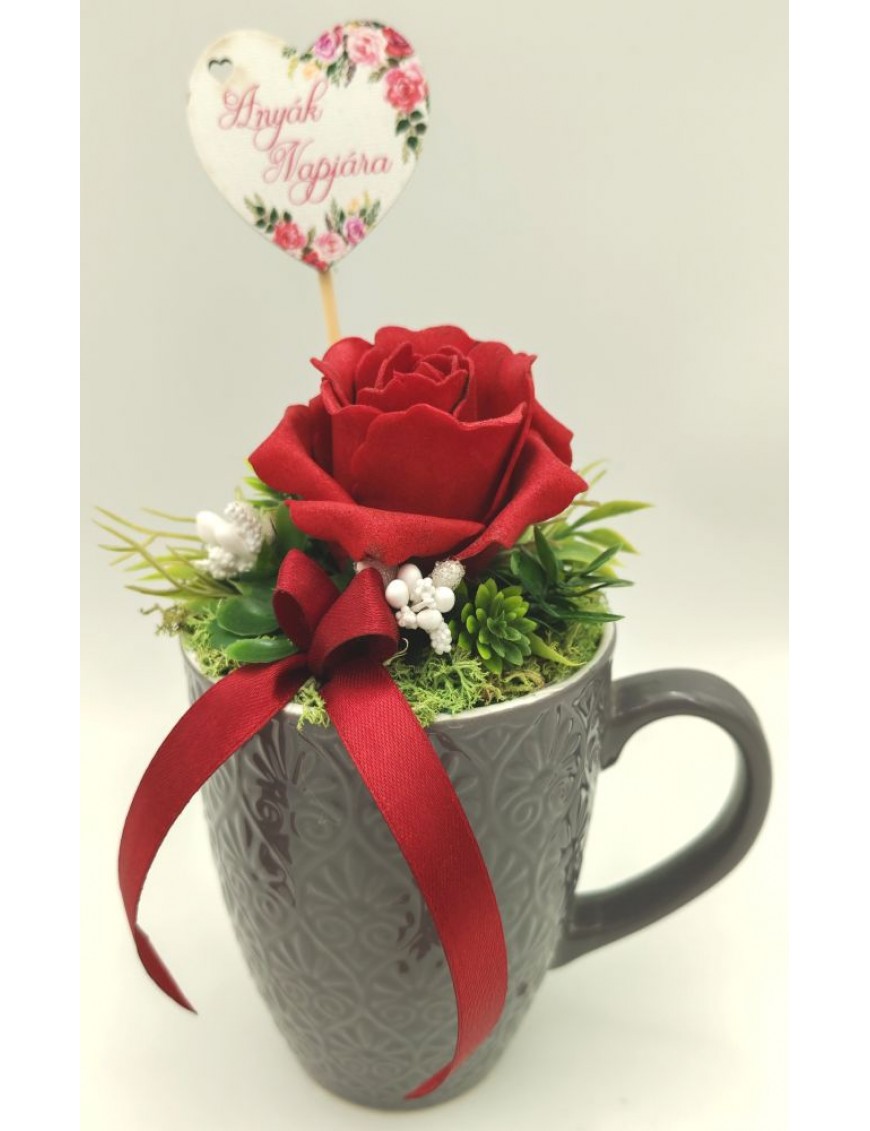 Szürke kerámia bögre bordó színű polifoam rózsával, beszúrós táblával: Anyák Napjára.