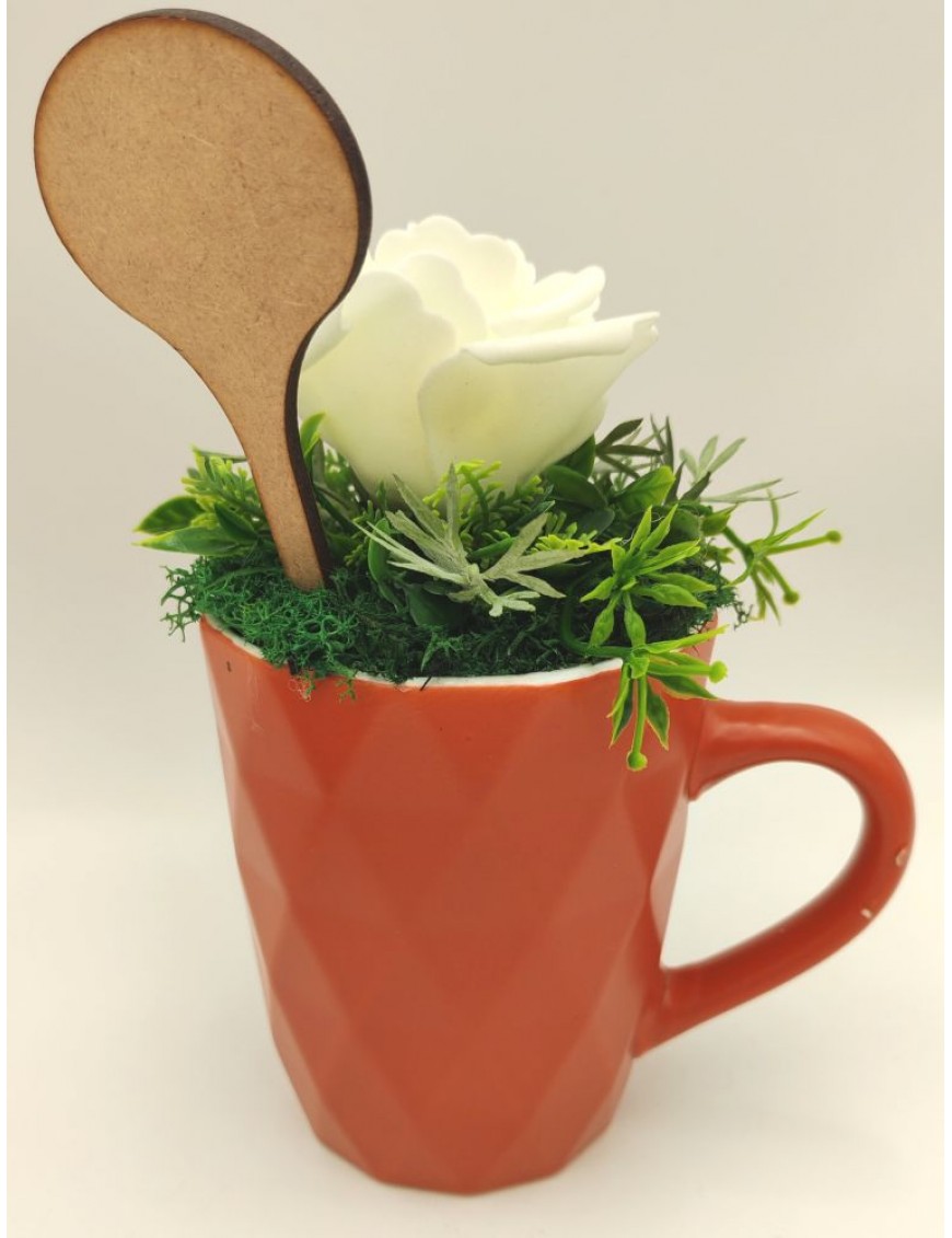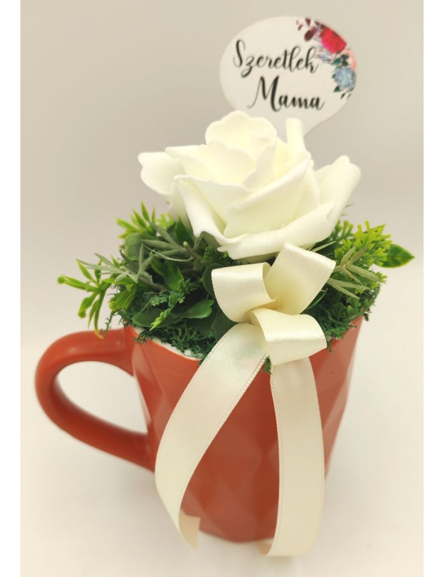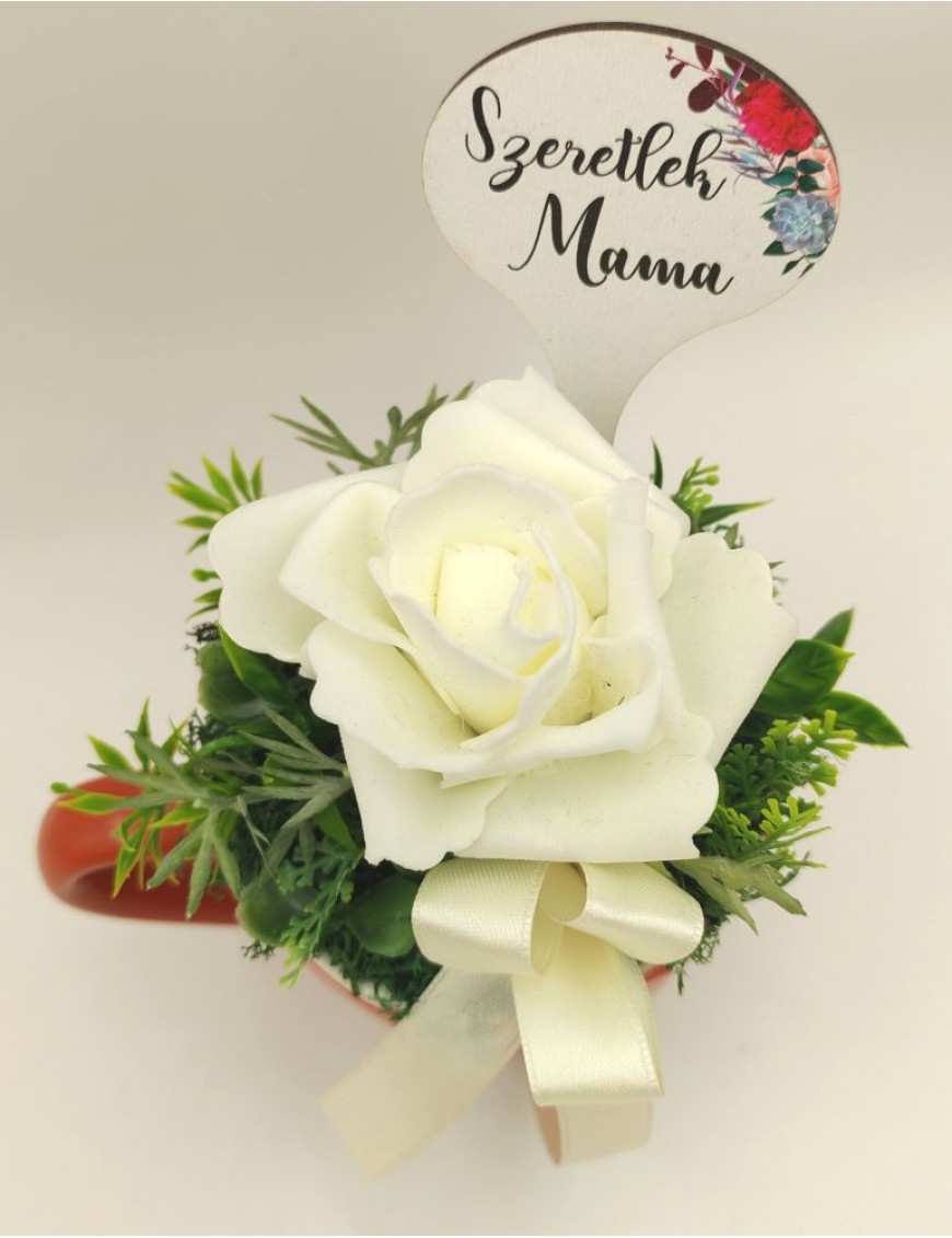 Narancssárga kerámia fehér polifoam rózsával, beszúrós táblával: Szeretlek Mama.