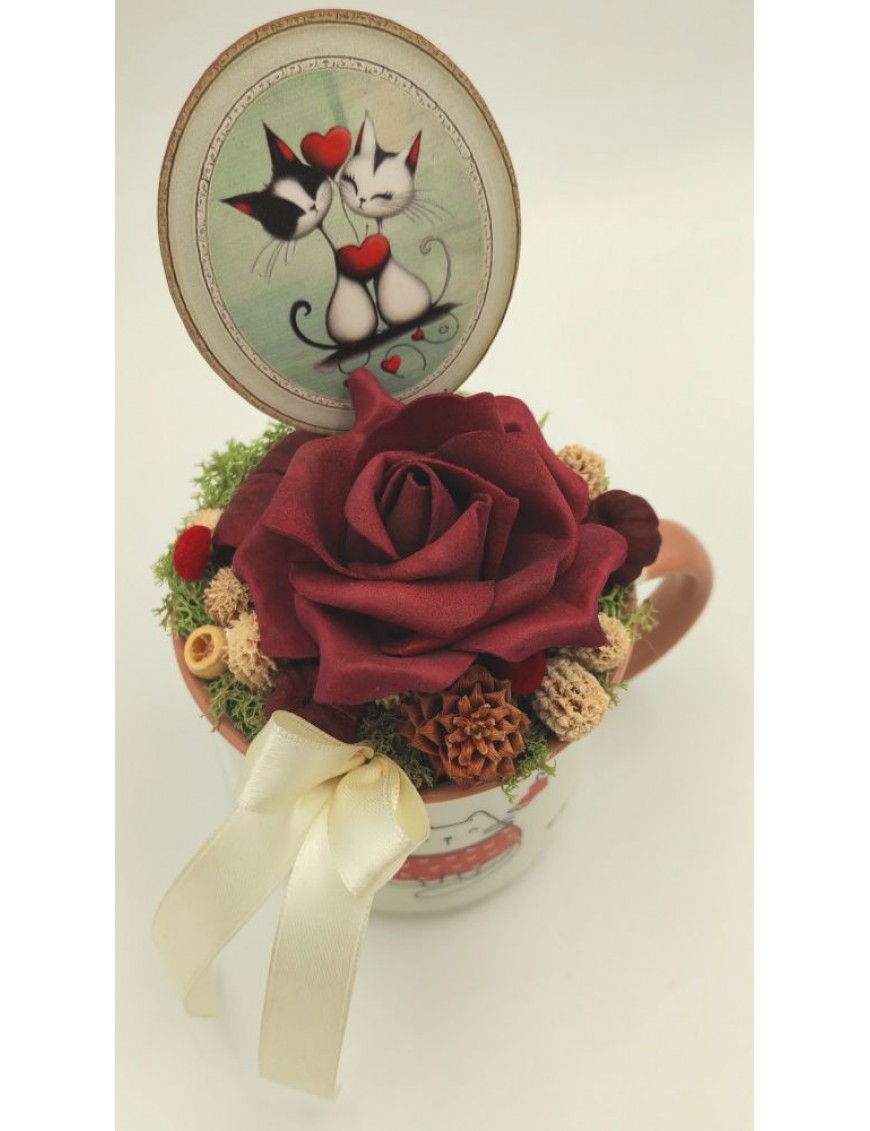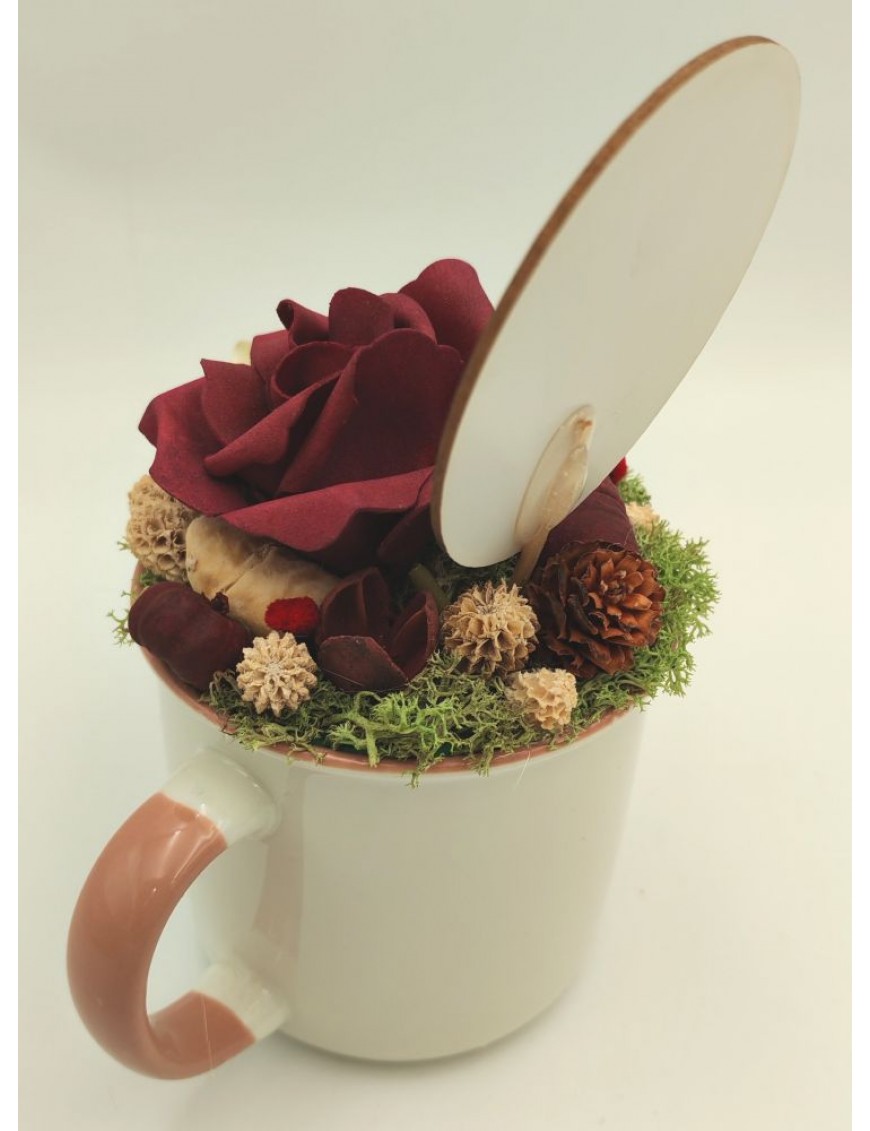 Díszített bögre bordó polifoam rózsával, táblával.
