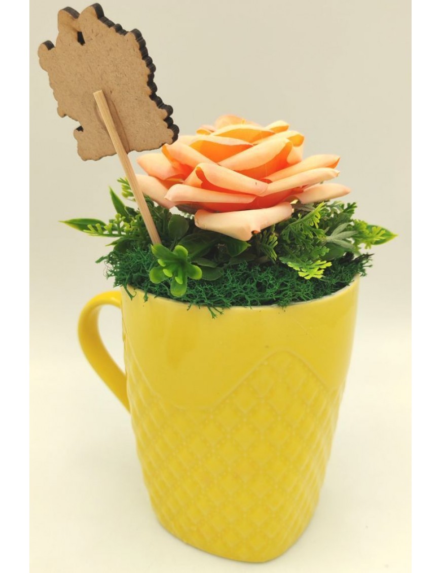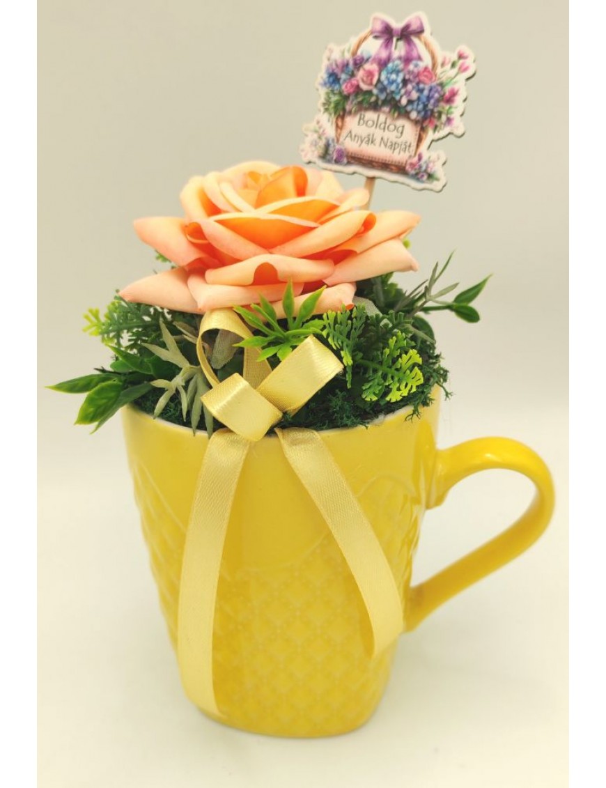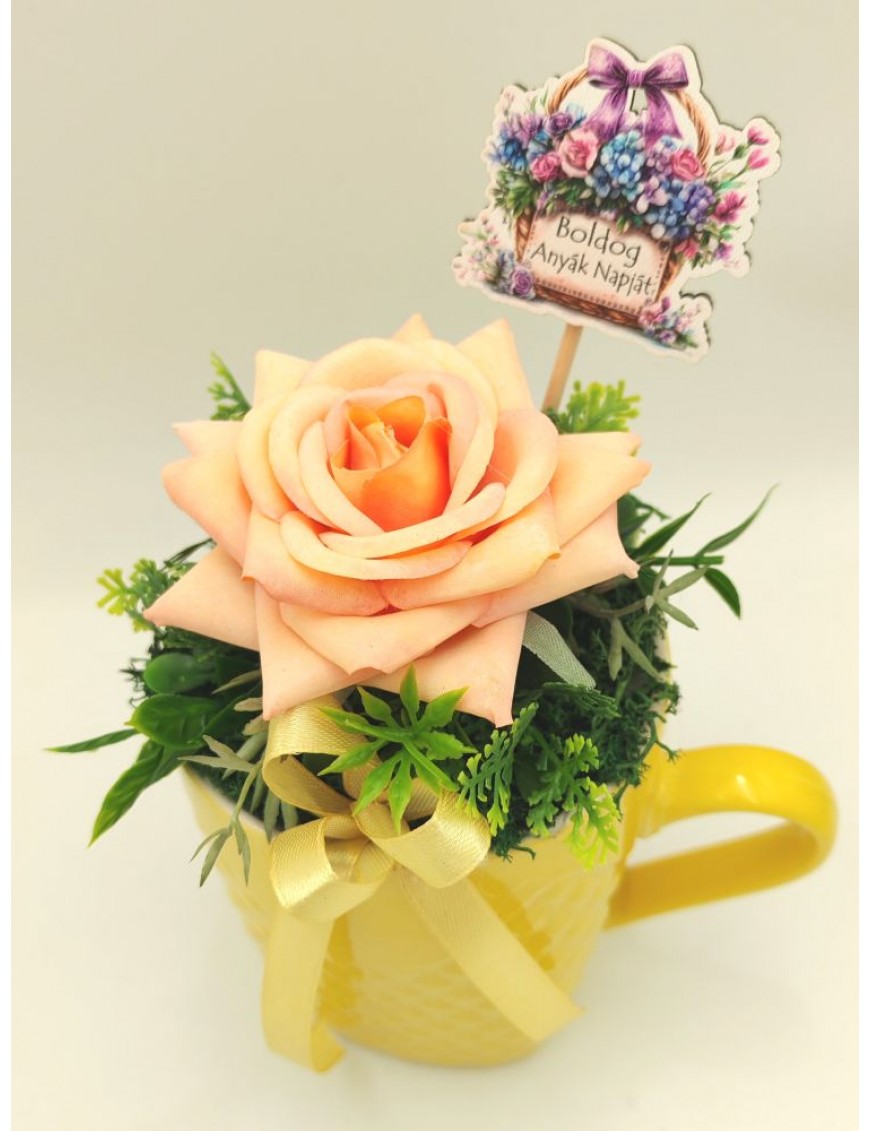 Sárga kerámia bögre barack színű selyem rózsával, beszúrós táblával: Boldog Anyák Napját.