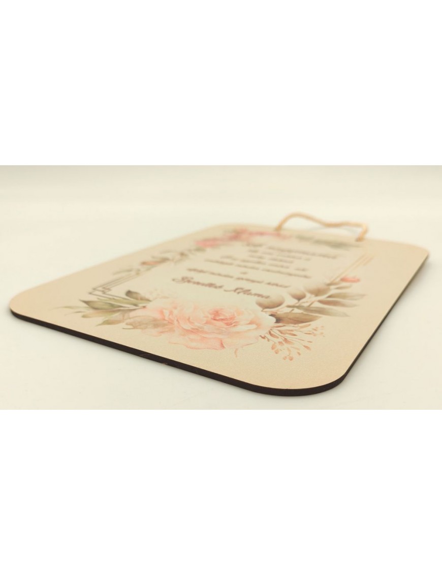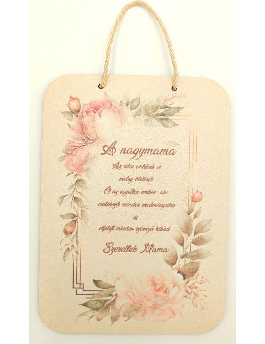 Fából készült, nyomtatott tábla virágos mintával, felirattal.