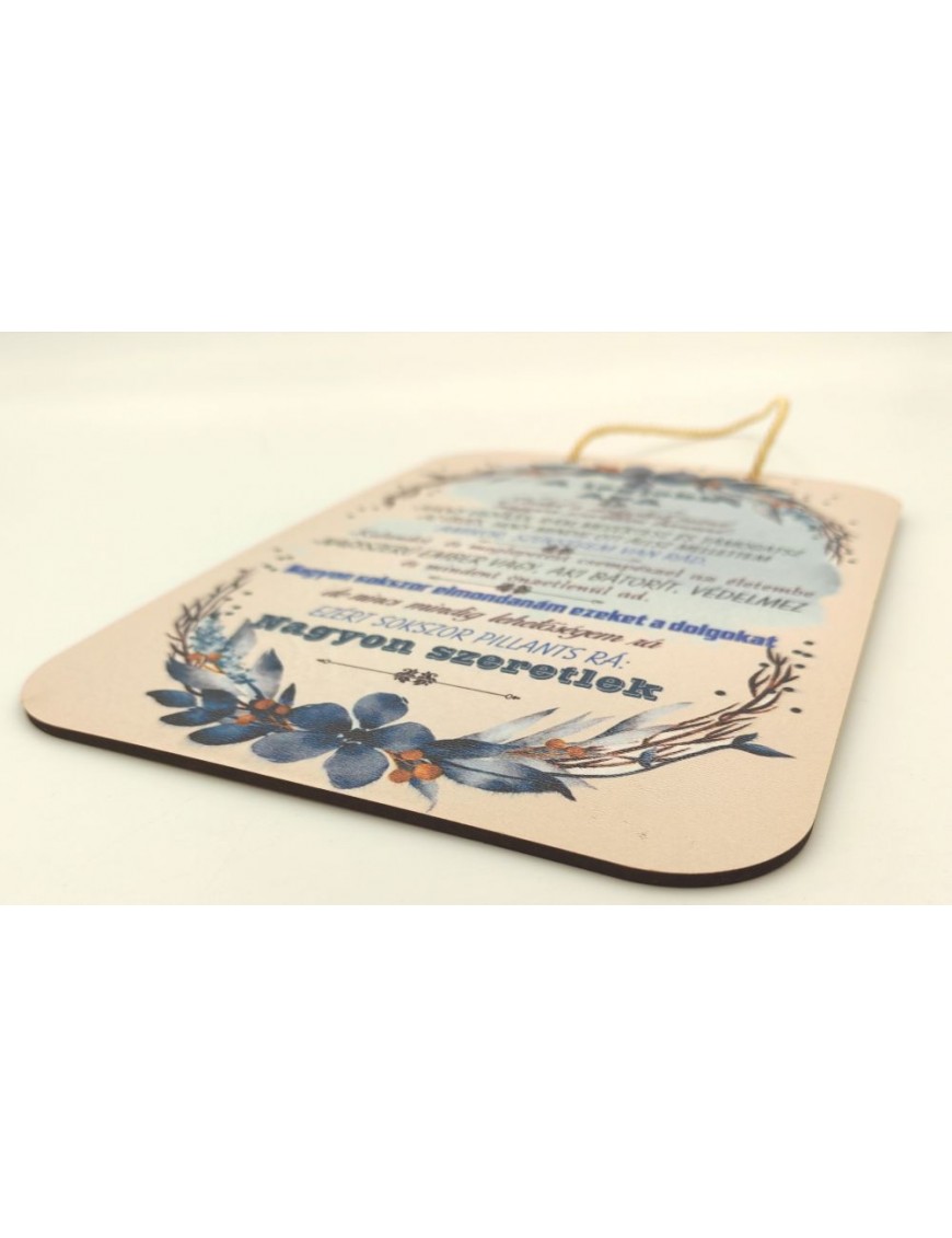 Fából készült, nyomtatott tábla virágos mintával, felirattal.