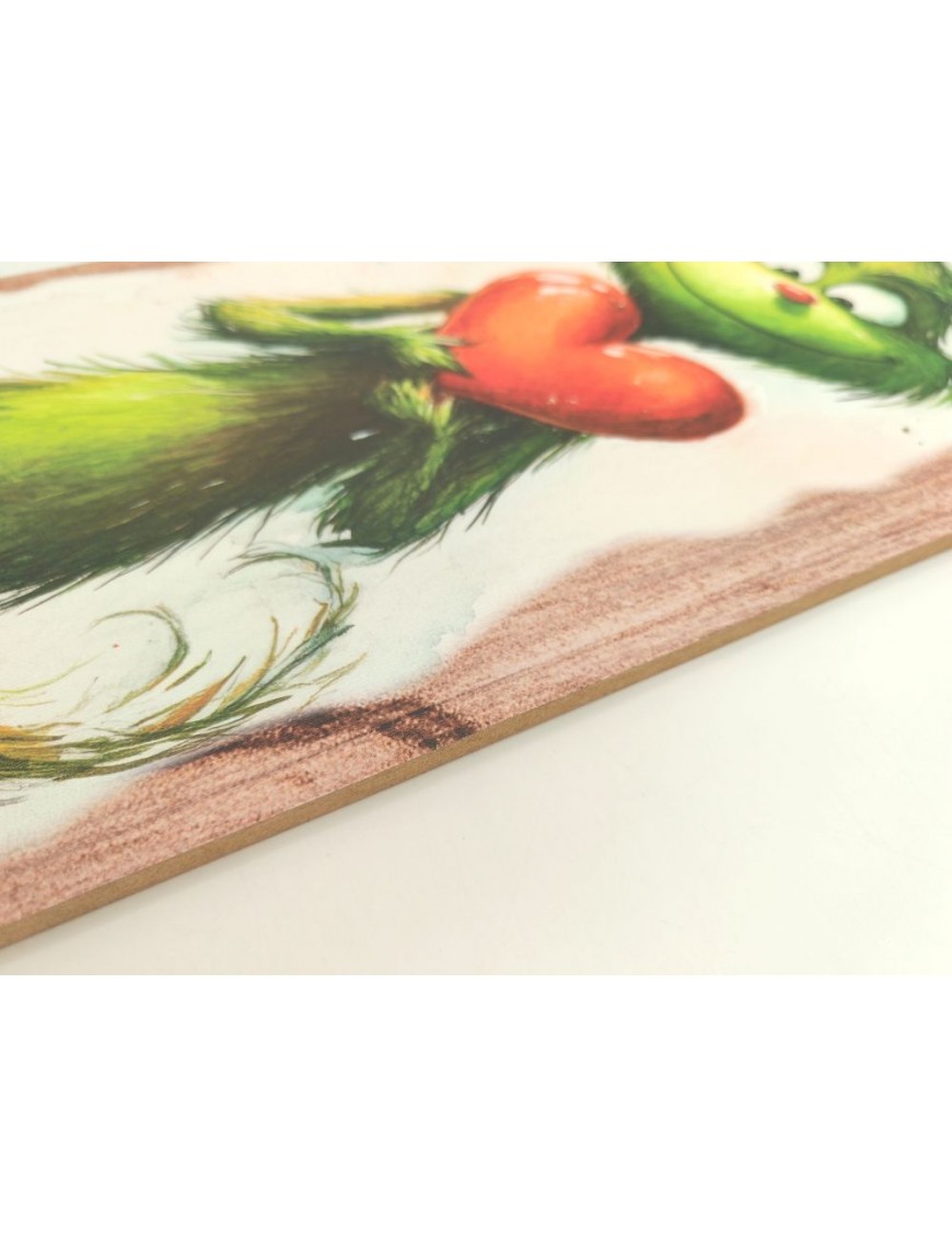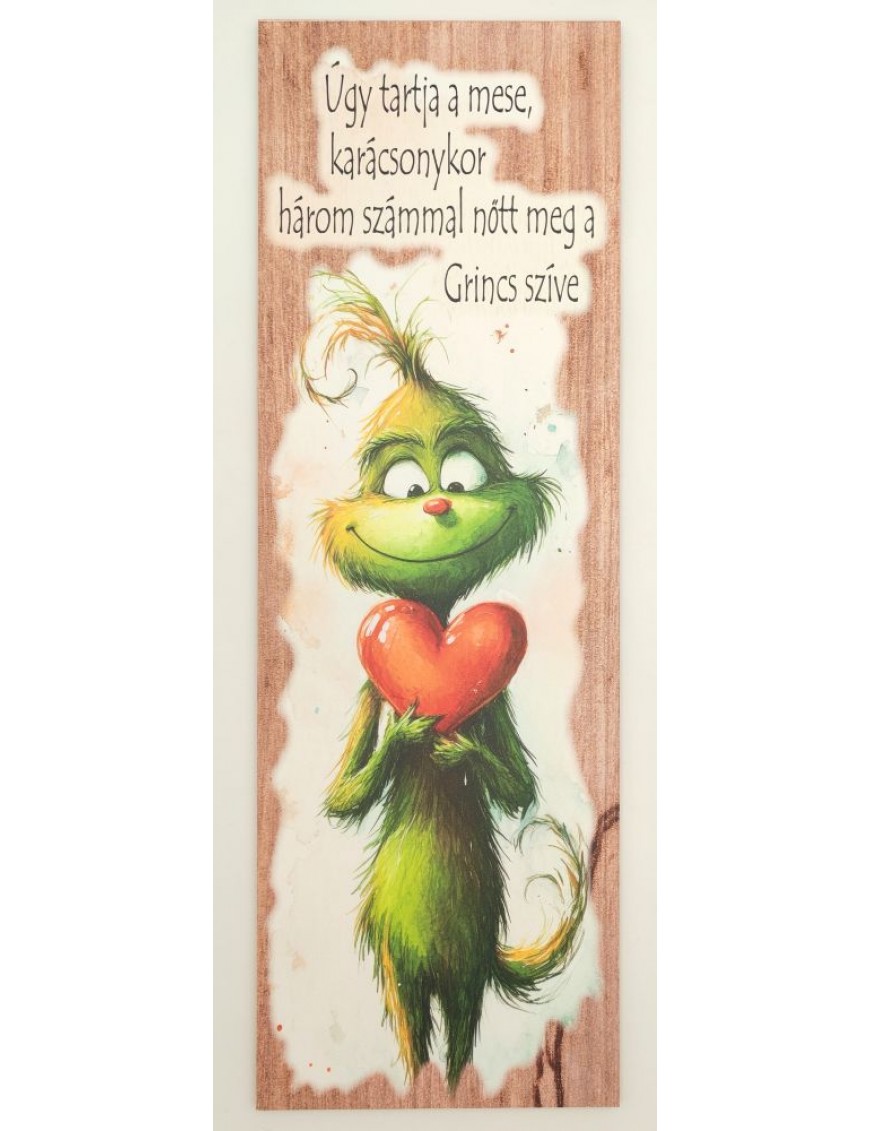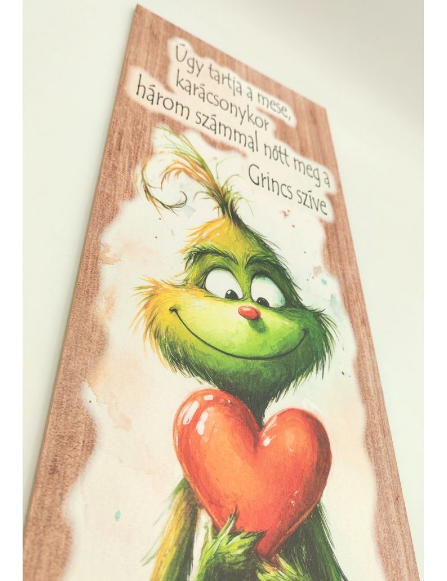 Nagy méretű, nyomtatott fa tábla Grincs figurával, felirattal: Úgy tartja a mese, Karácsonykor három számmal nőtt meg a Grincs szíve.