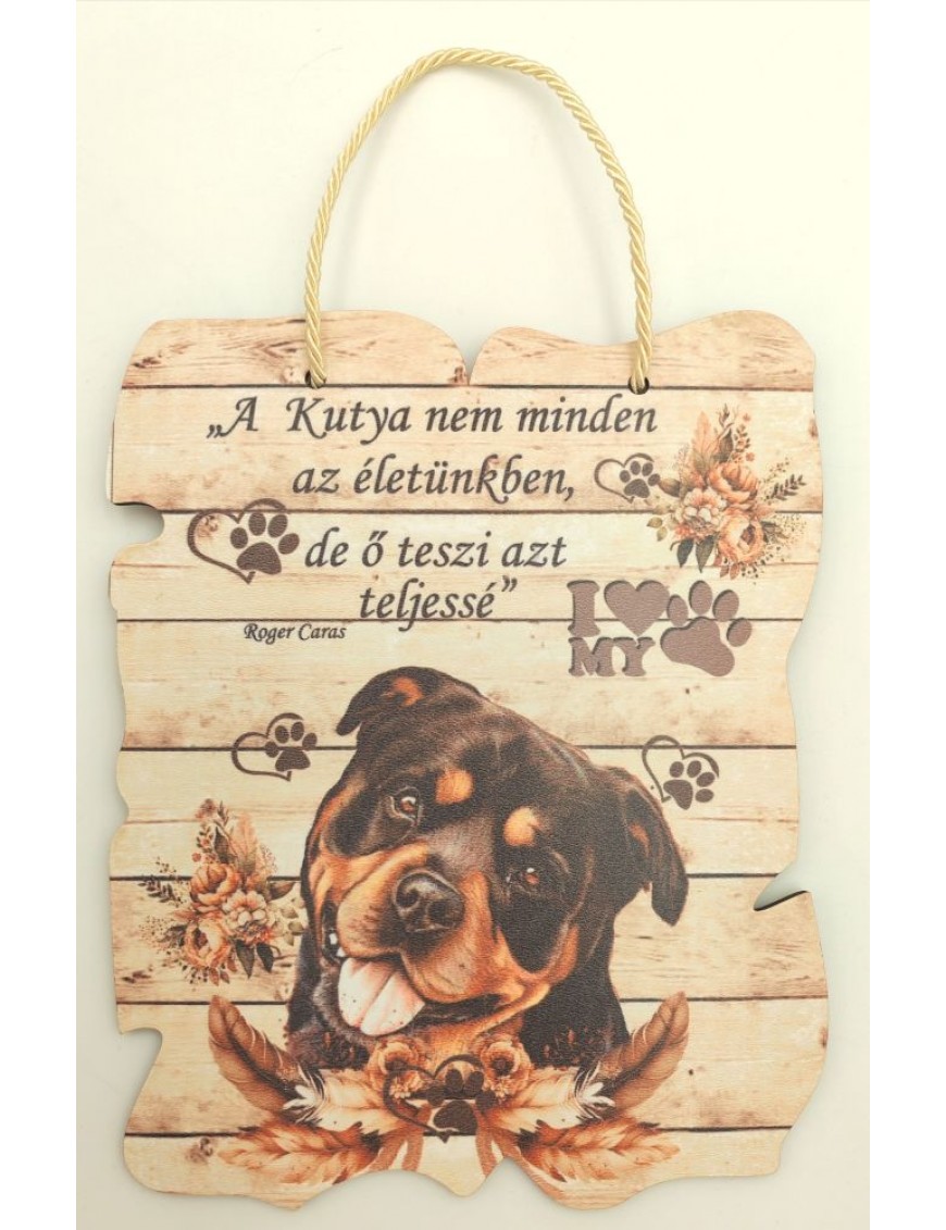 Fából készült, nyomtatott tábla Rottweiler kutya mintával, felirattal.