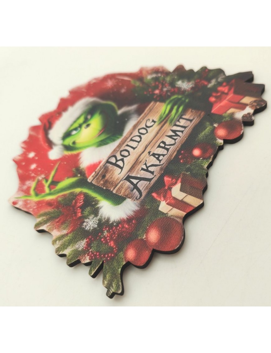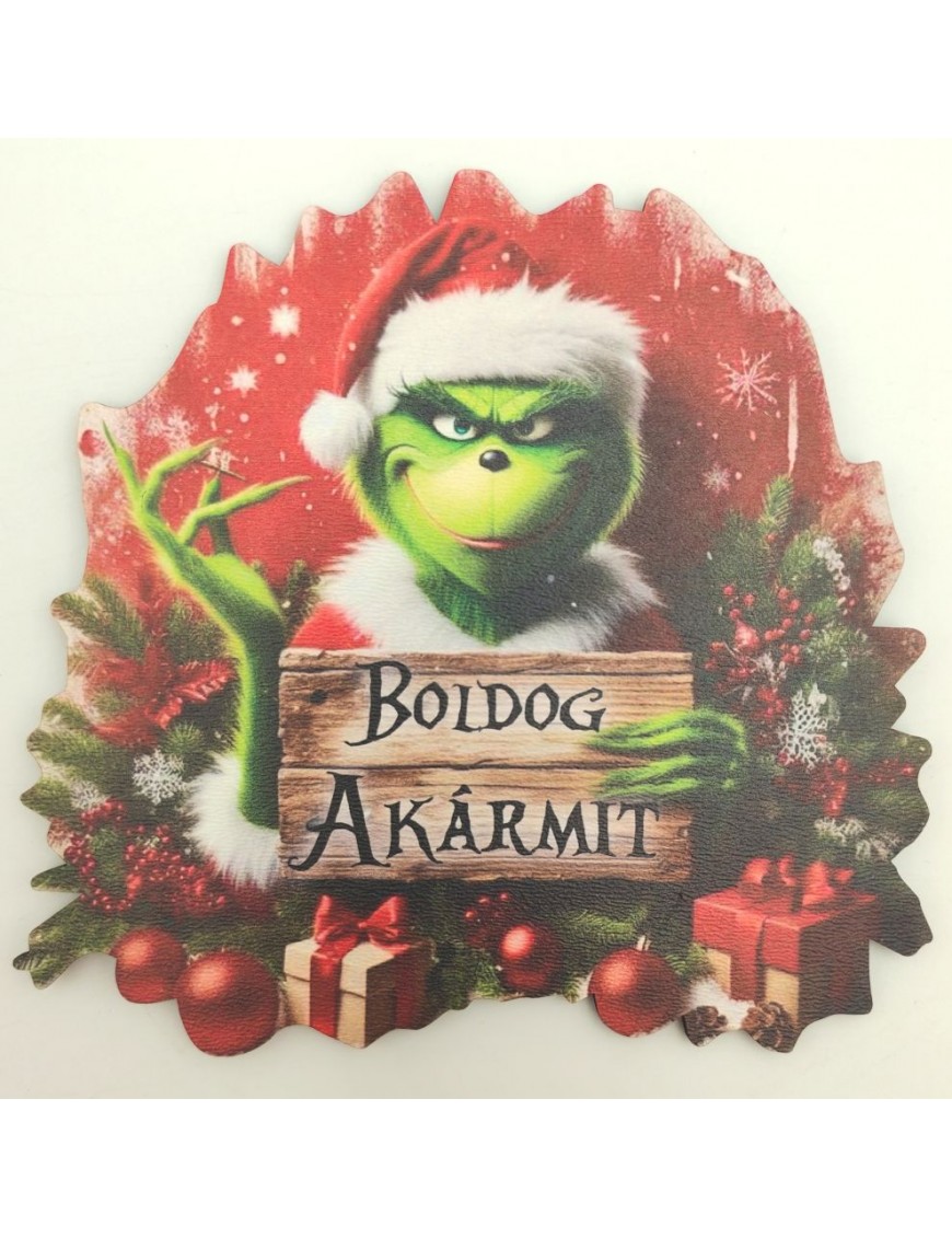 Formára vágott fa tábla Grinccsel, Boldog Akármit felirattal.