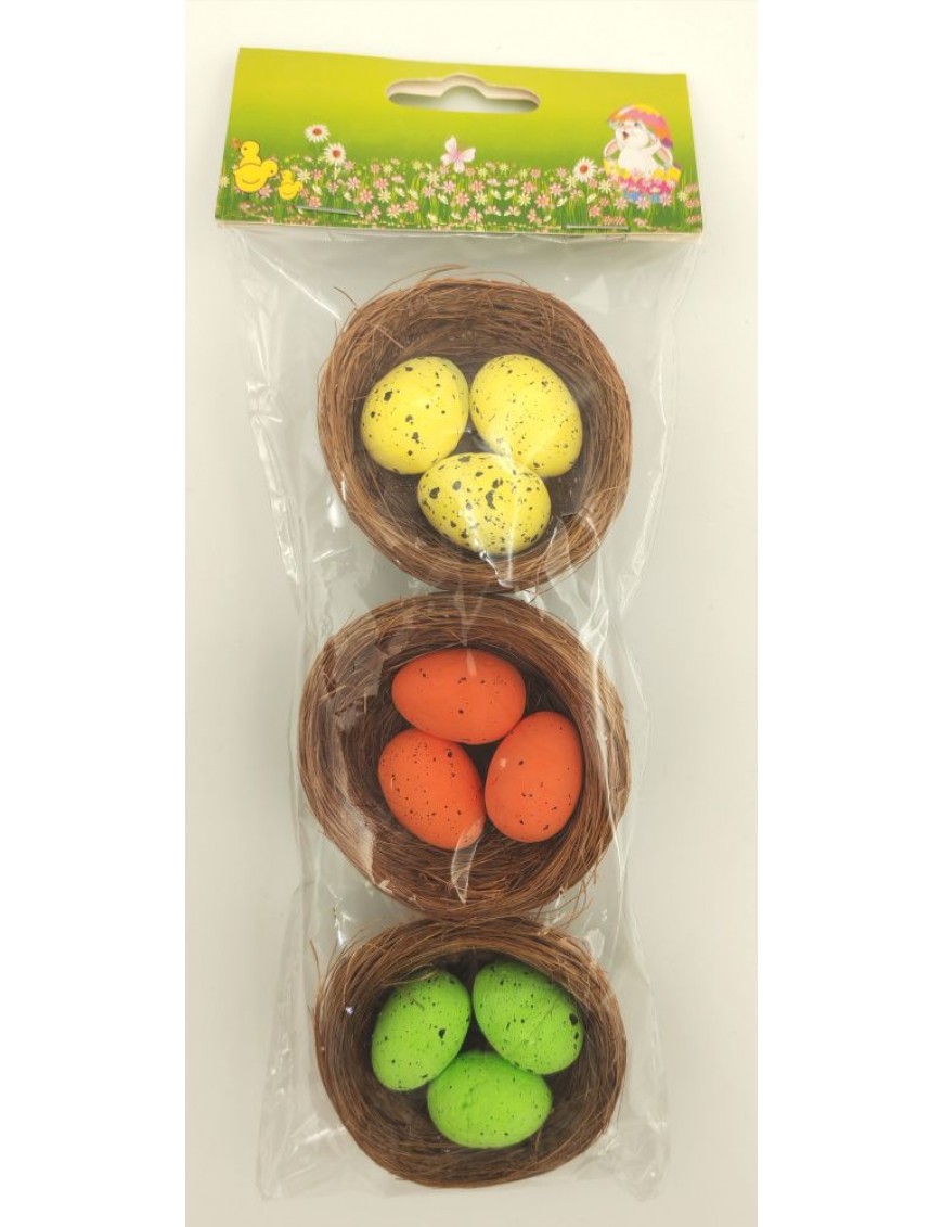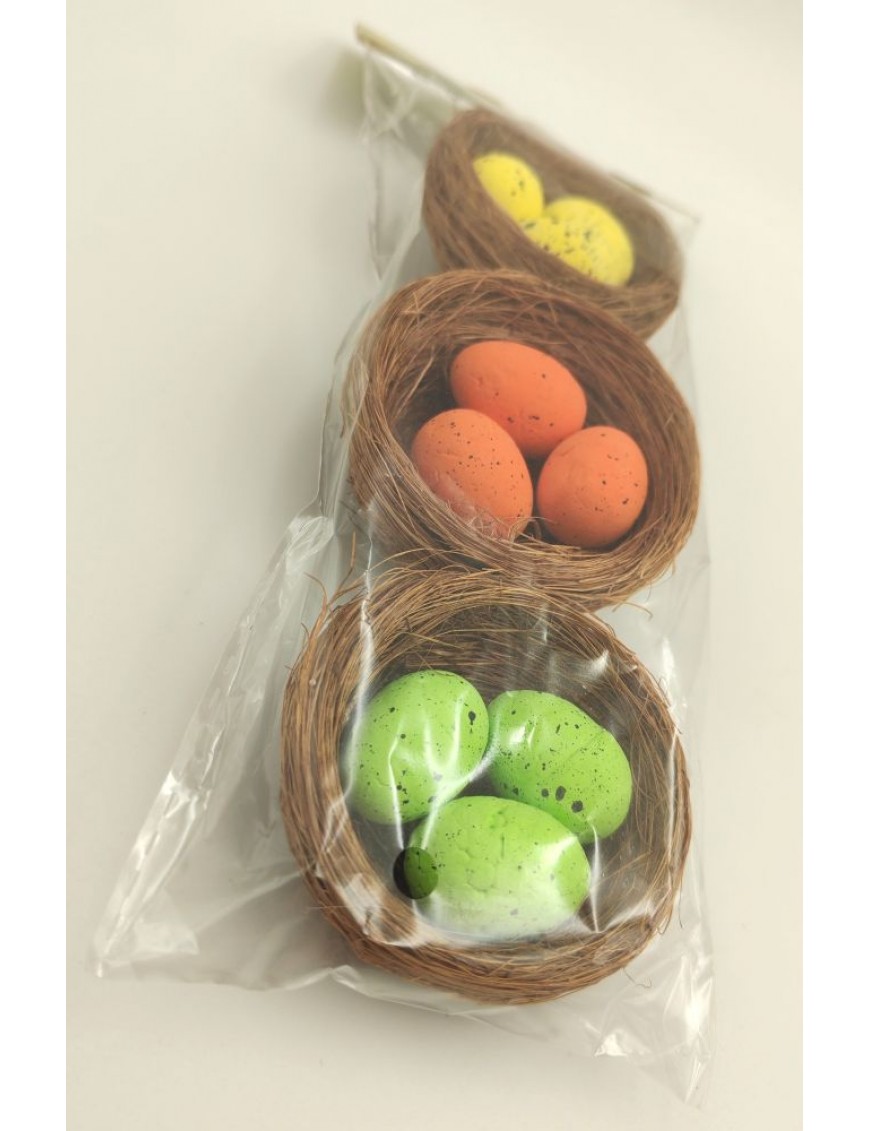 Festett, hungarocell fürjtojások barna fészekben, 3 darabos csomagban sárga, narancs és zöld színben.