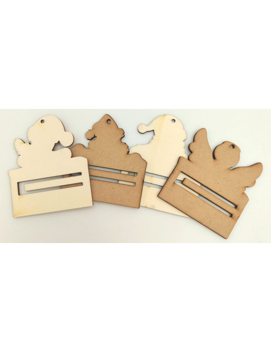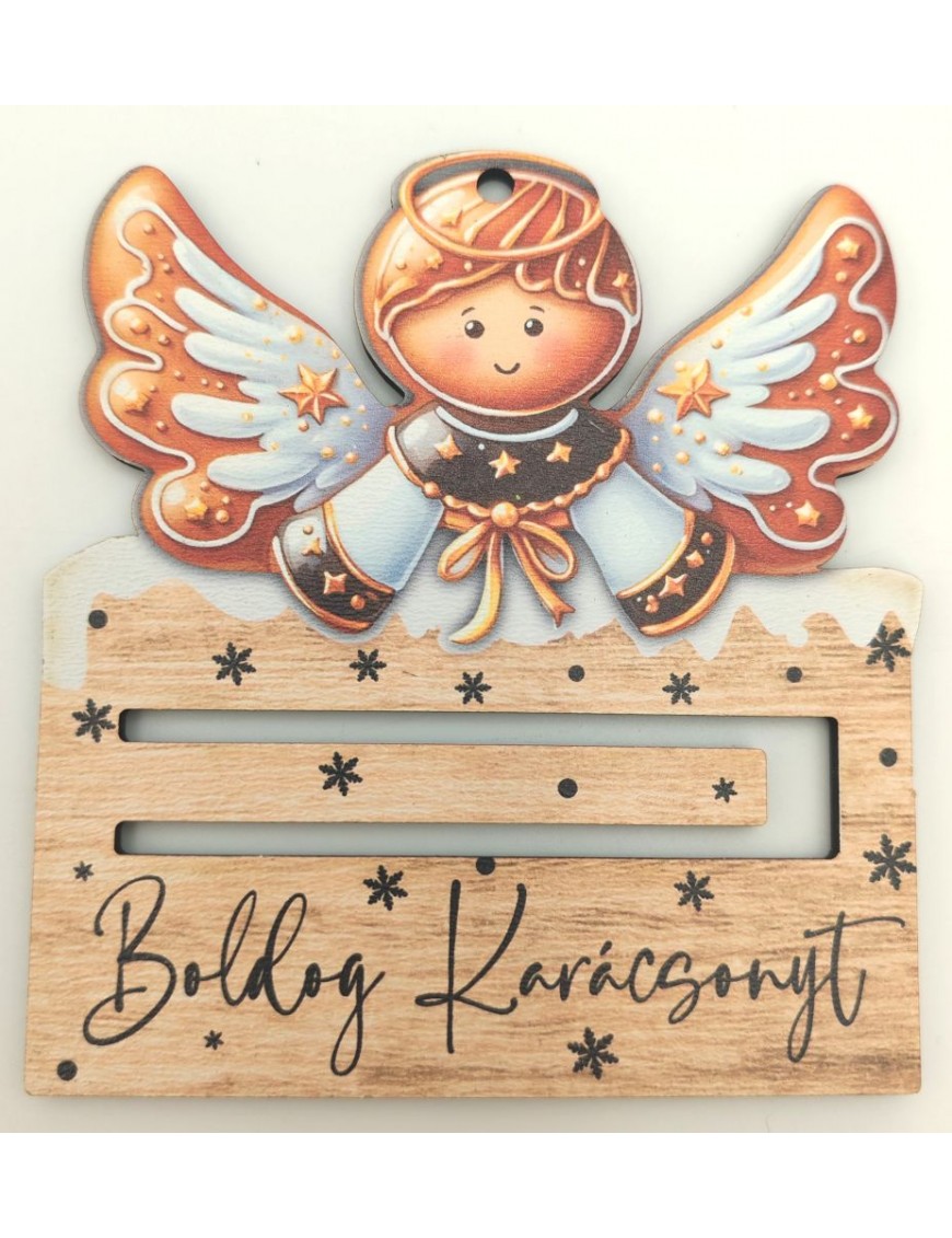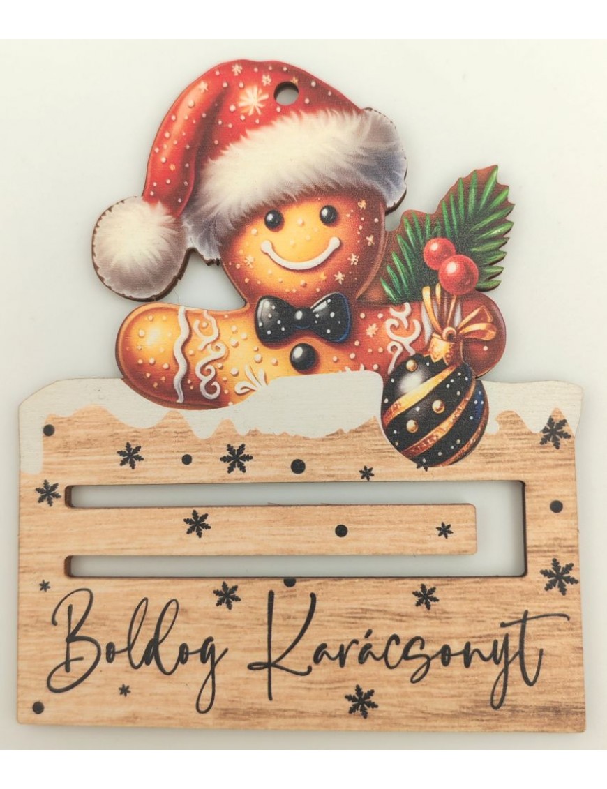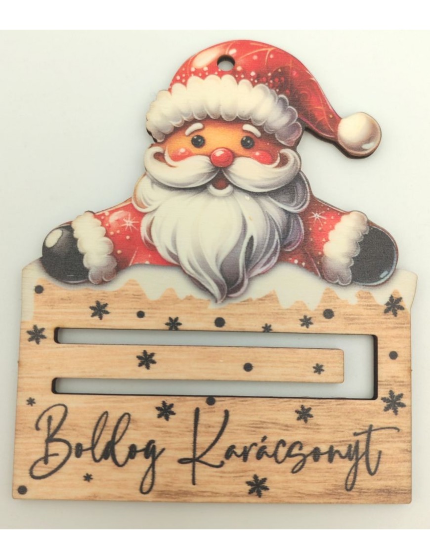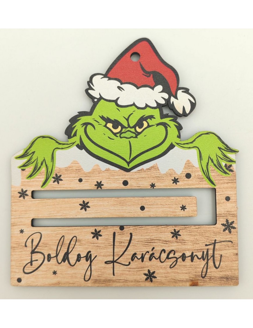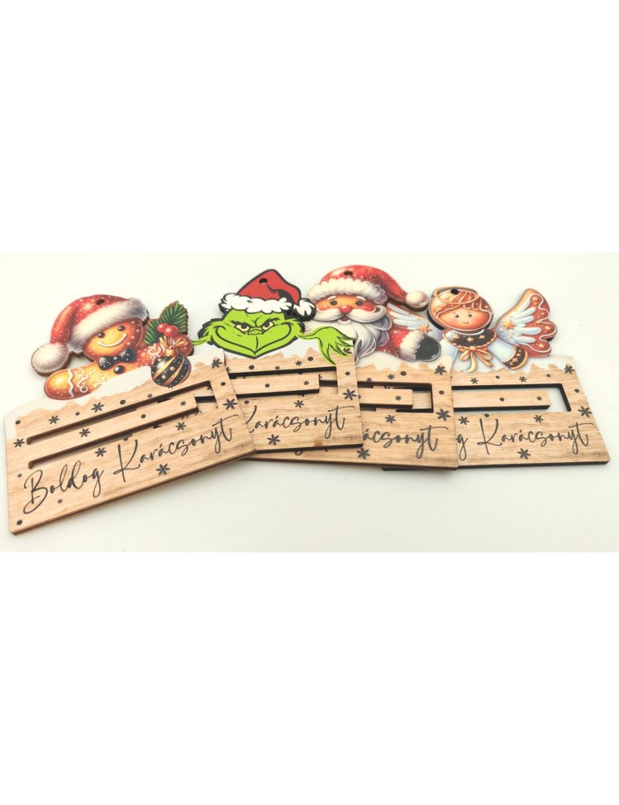 Fából készült, nyomtatott pénztartó négyféle mintával: Grincs, angyal, télapó, mézeskalács.