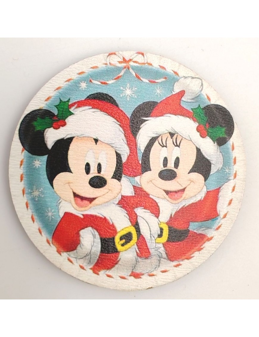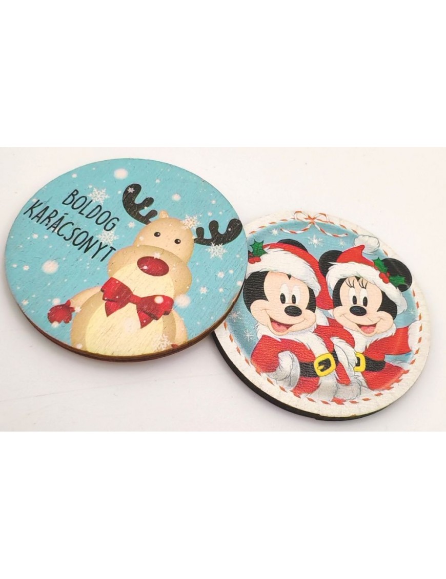 Nyomtatott fa tábla kétféle karácsonyi mintával: rénszarvas és Mickey-Minnie.