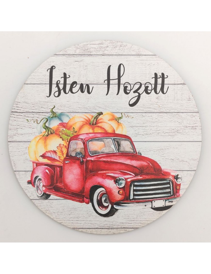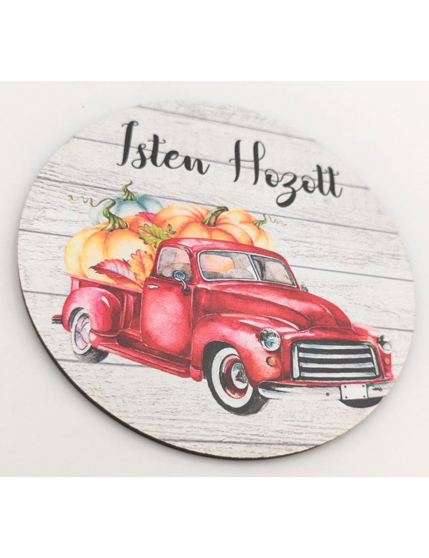 Fa tábla őszi mintával, piros autóval, Isten hozott felirattal.