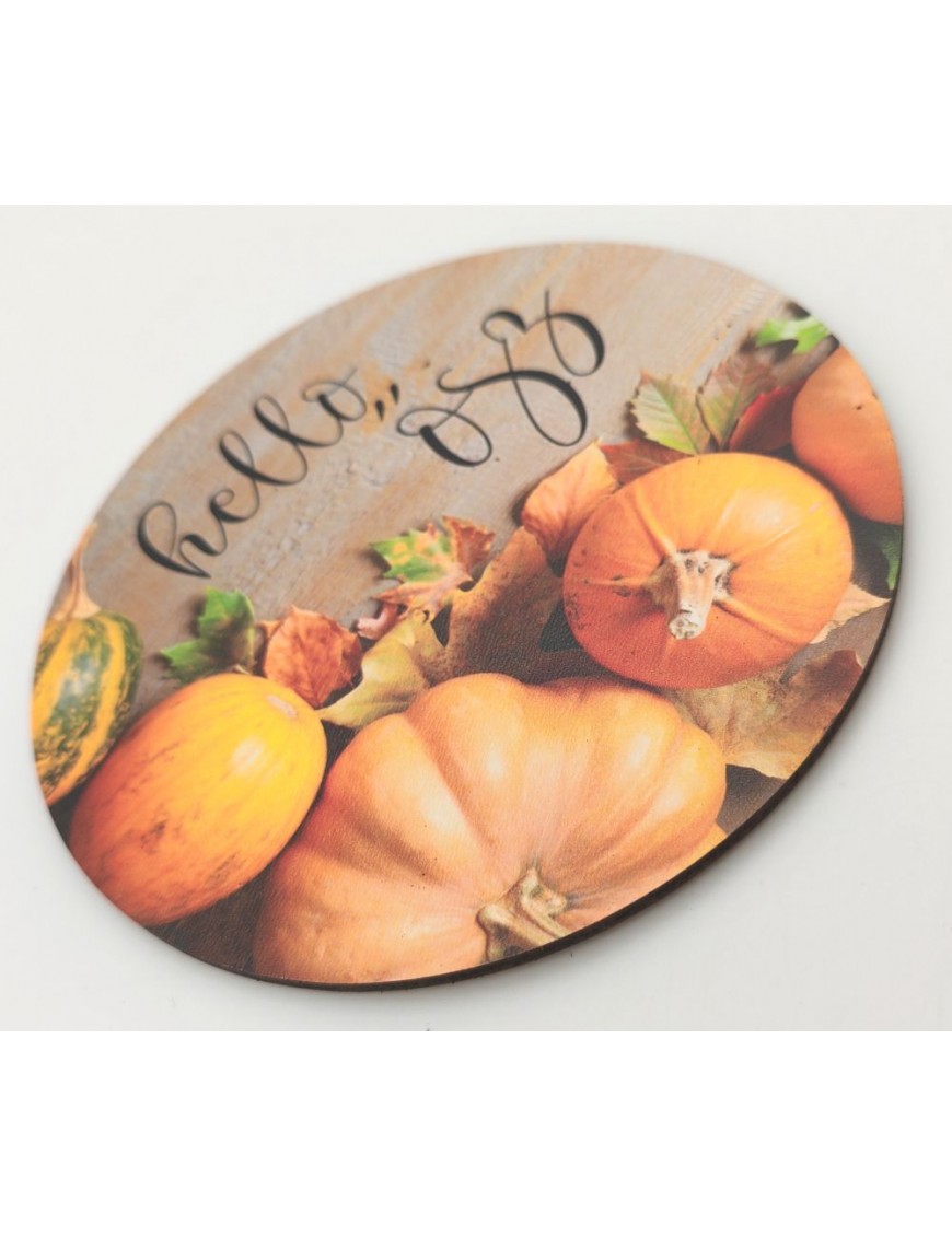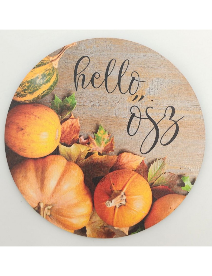 Kerek fa tábla tökökkel, hello ősz felirattal.