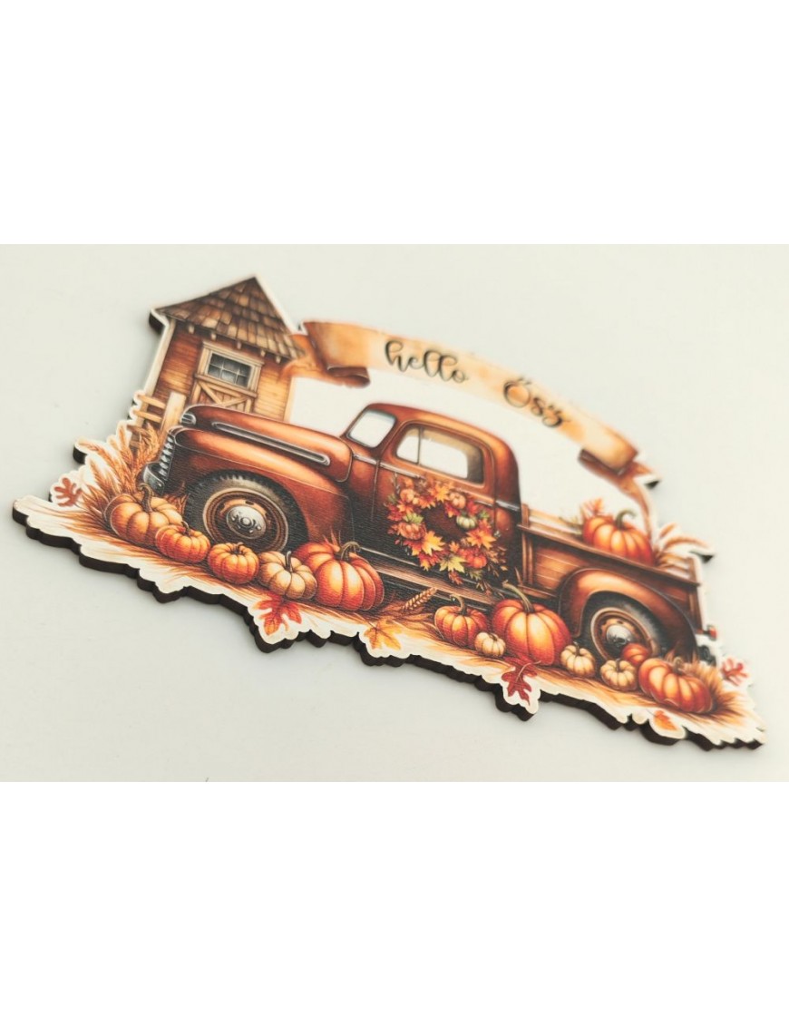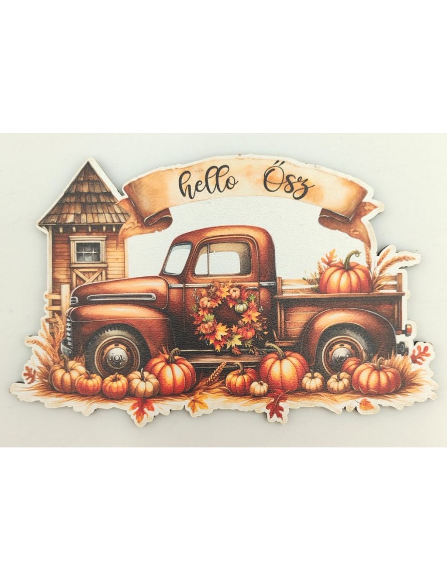 Formára vágott őszi fa tábla autóval, hello ősz felirattal.
