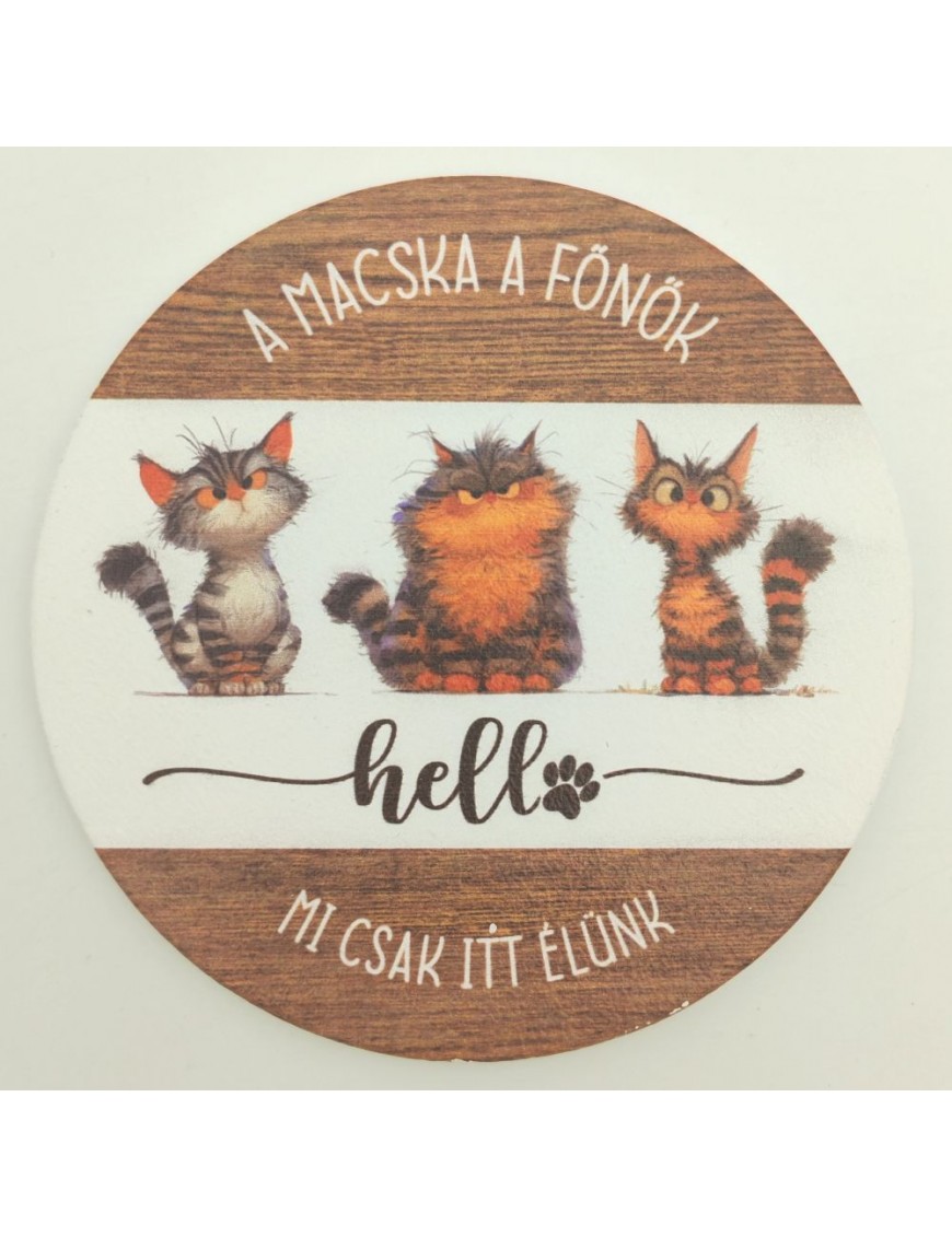 Kerek, nyomtatott fa tábla macskákkal, felirattal: A macska a főnök, mi csak itt élünk.