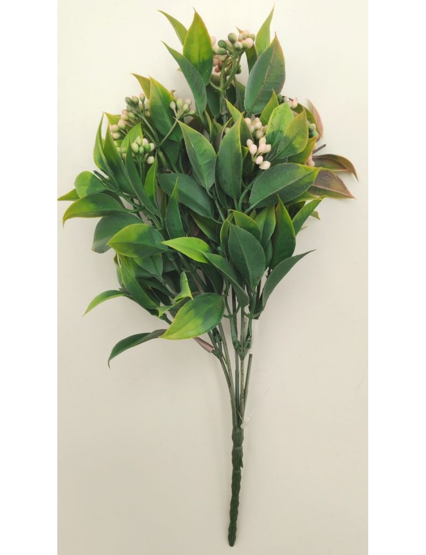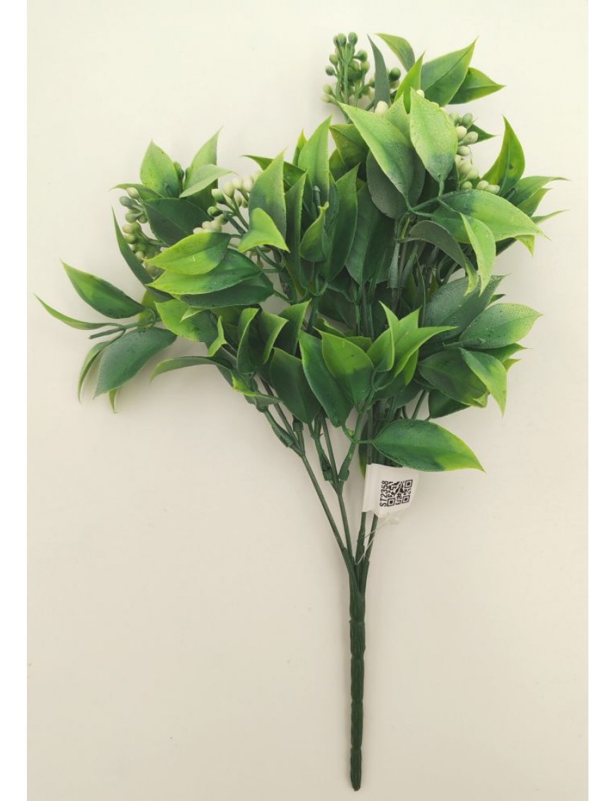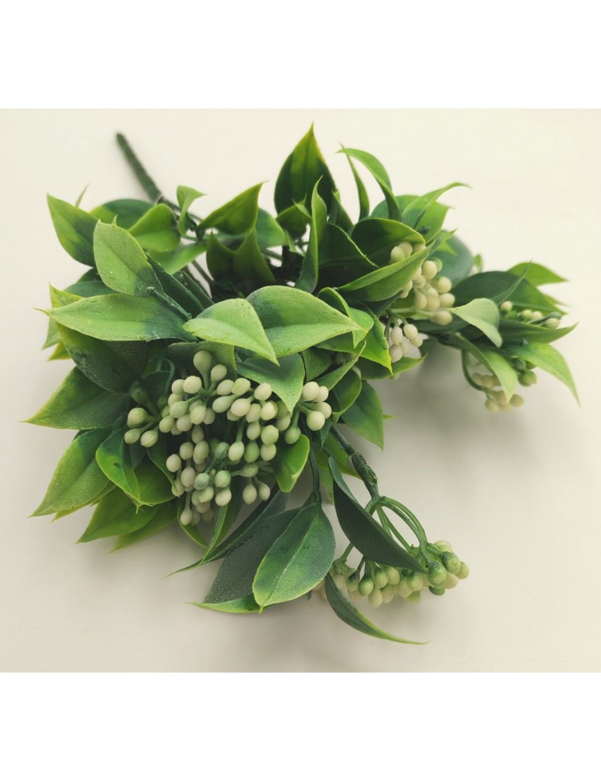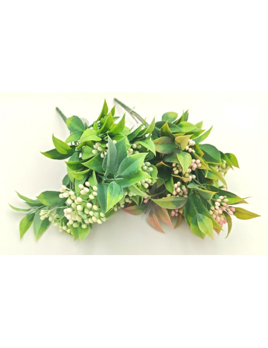 Díszítő csokor hosszúkás levelekkel, fehér vagy rózsaszín bogyókkal.
