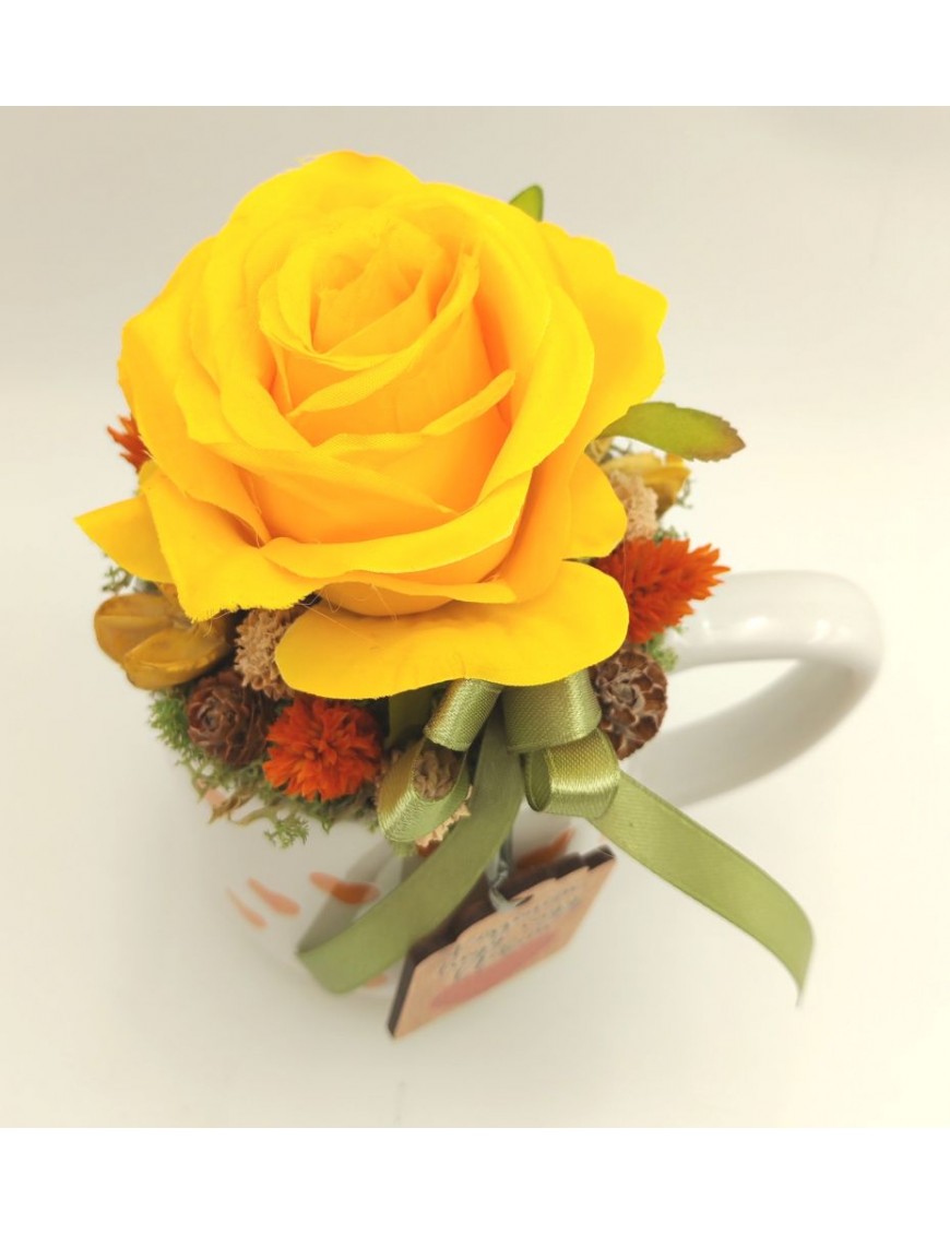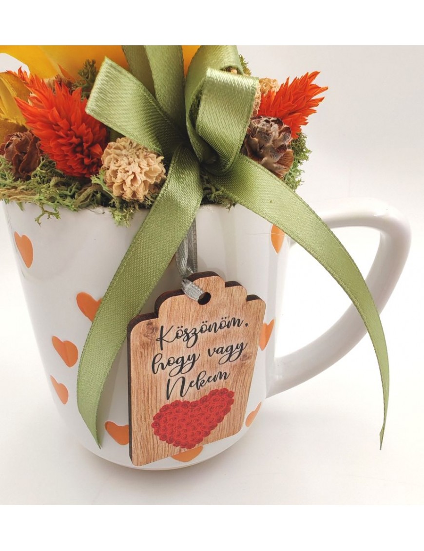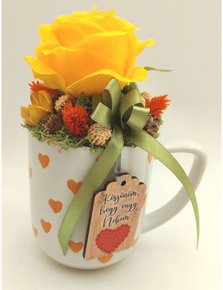 Fehér alapon narancssárga szíves bögre sárga selyem rózsával, kis táblával: Köszönöm, hogy vagy nekem.