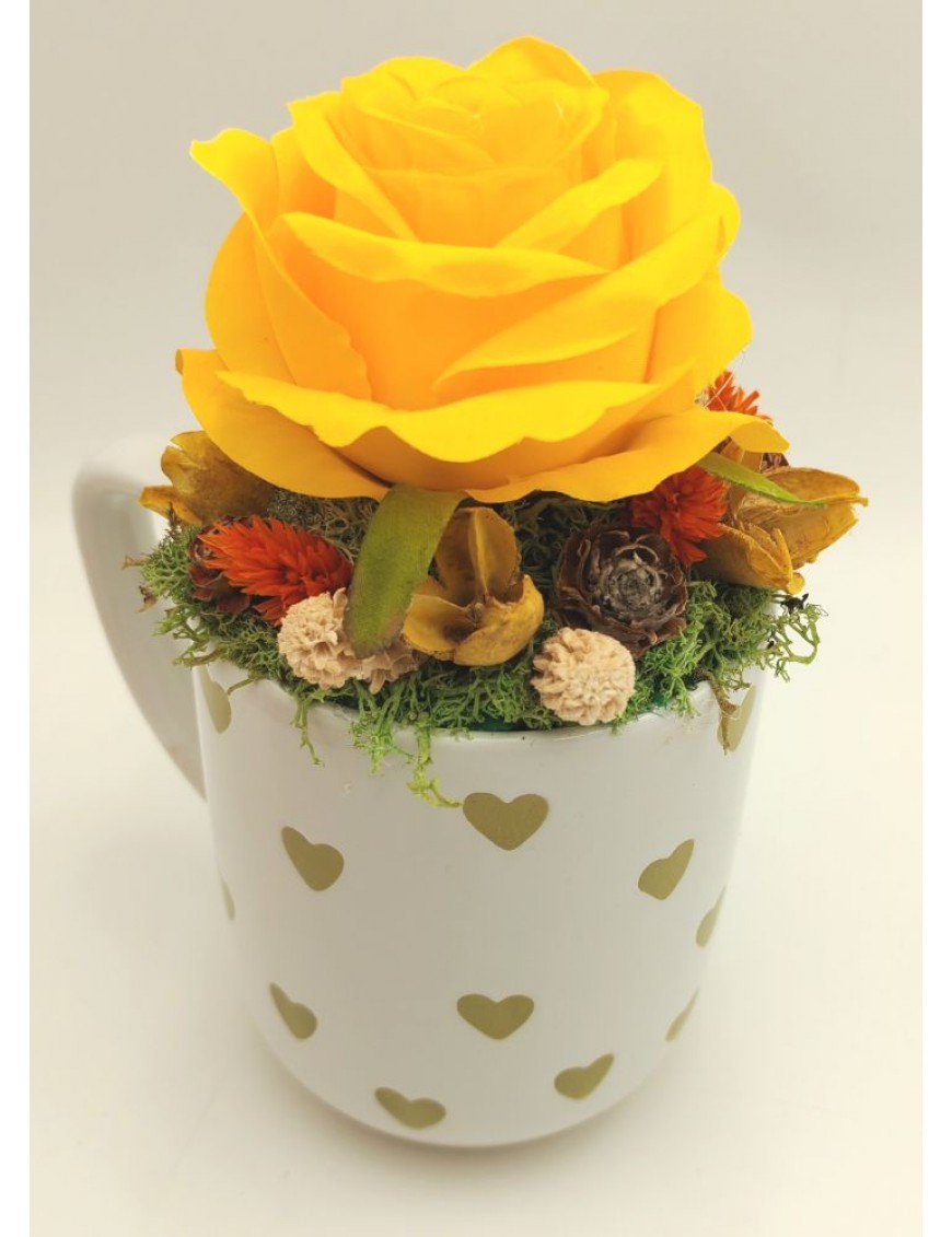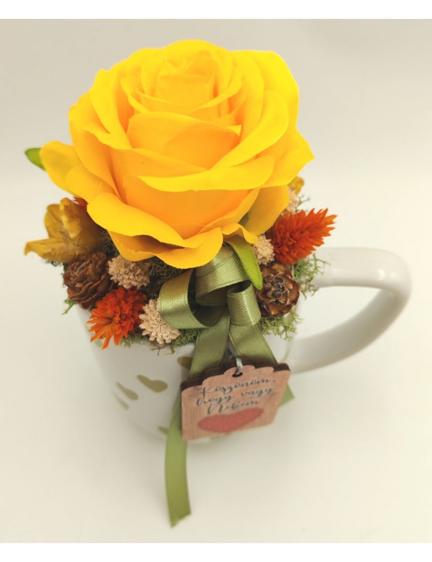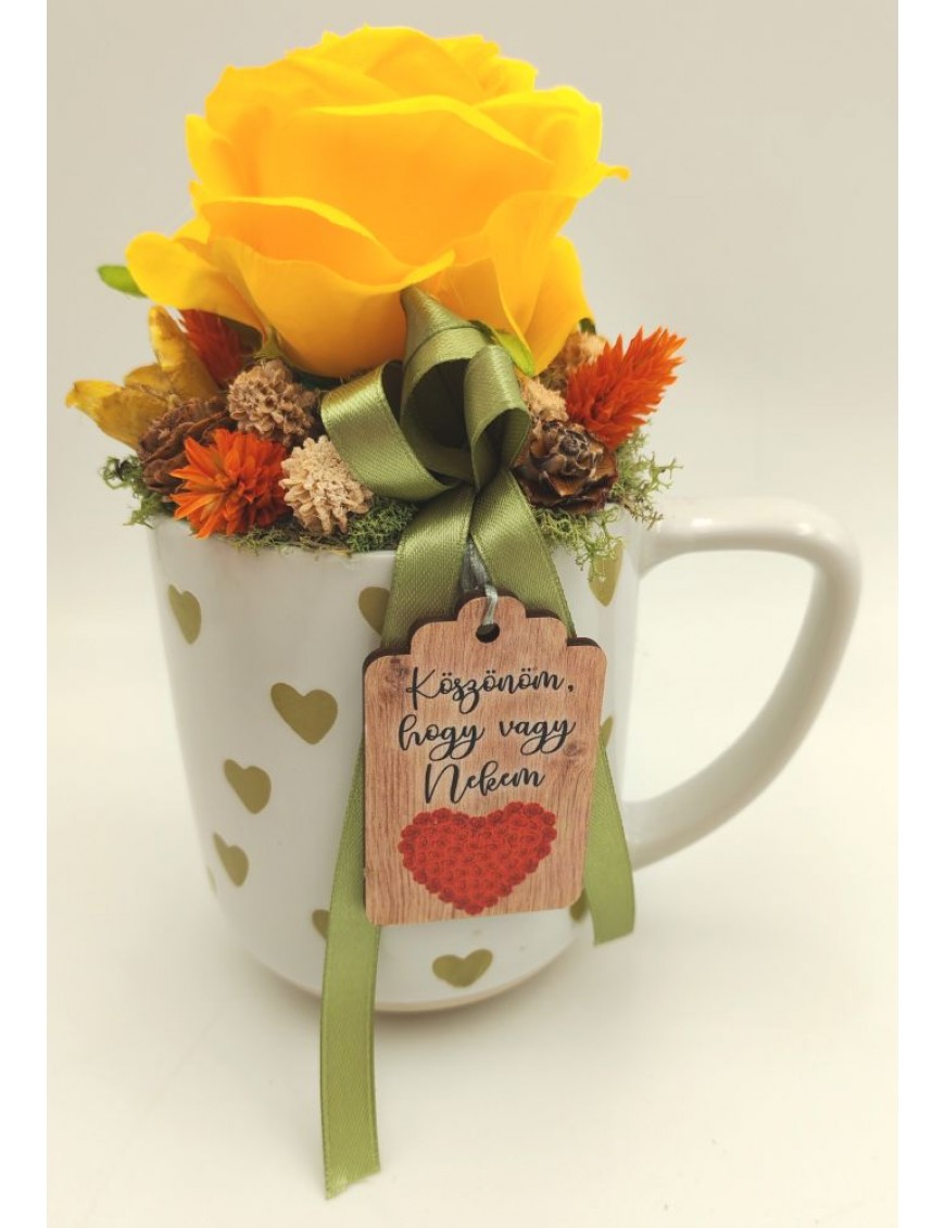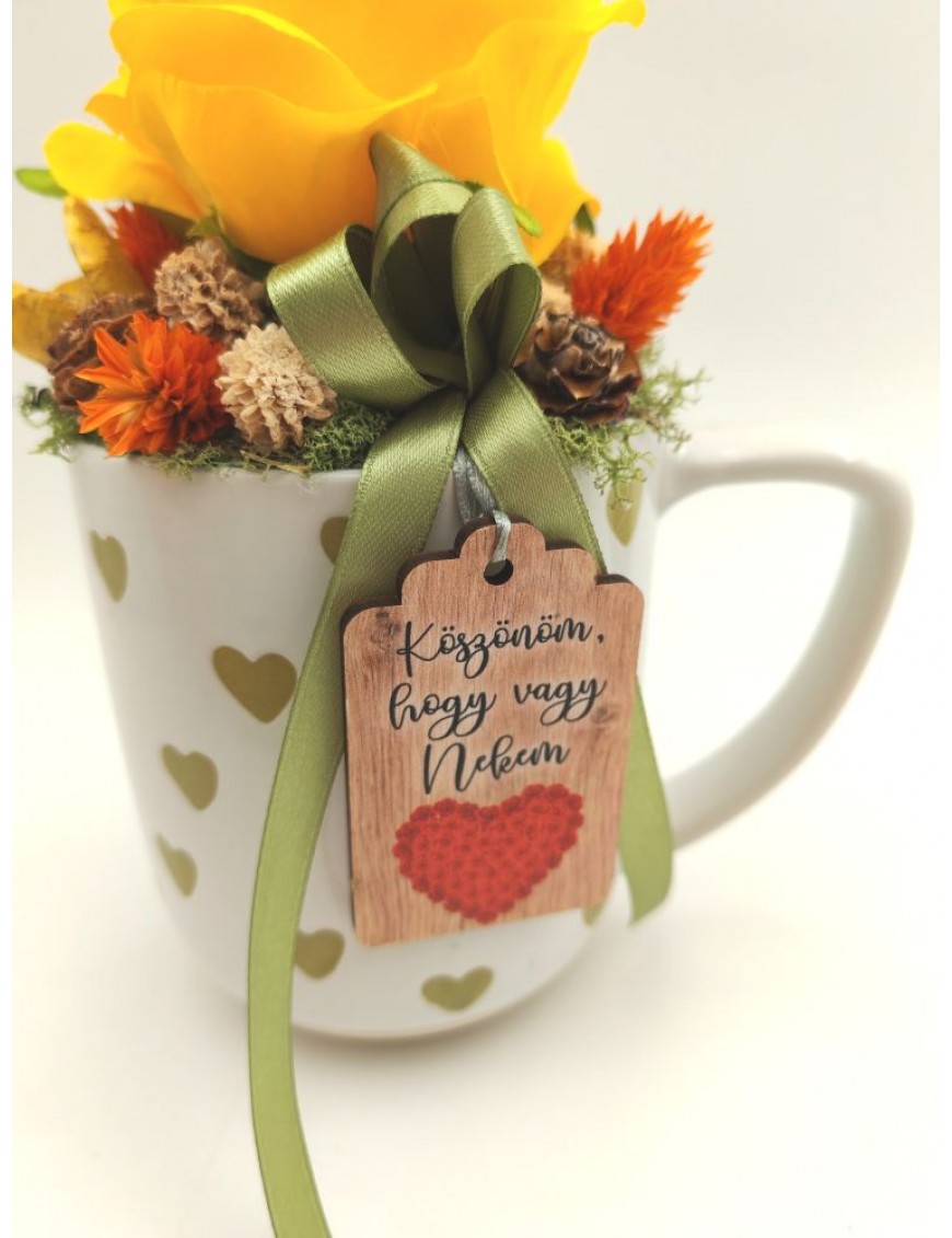 Fehér alapon zöld szíves bögre sárga selyem rózsával, kis táblával: Köszönöm, hogy vagy nekem.