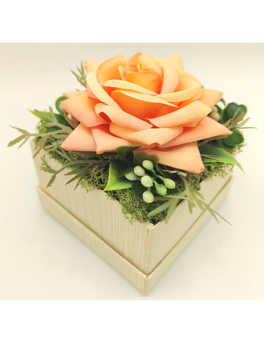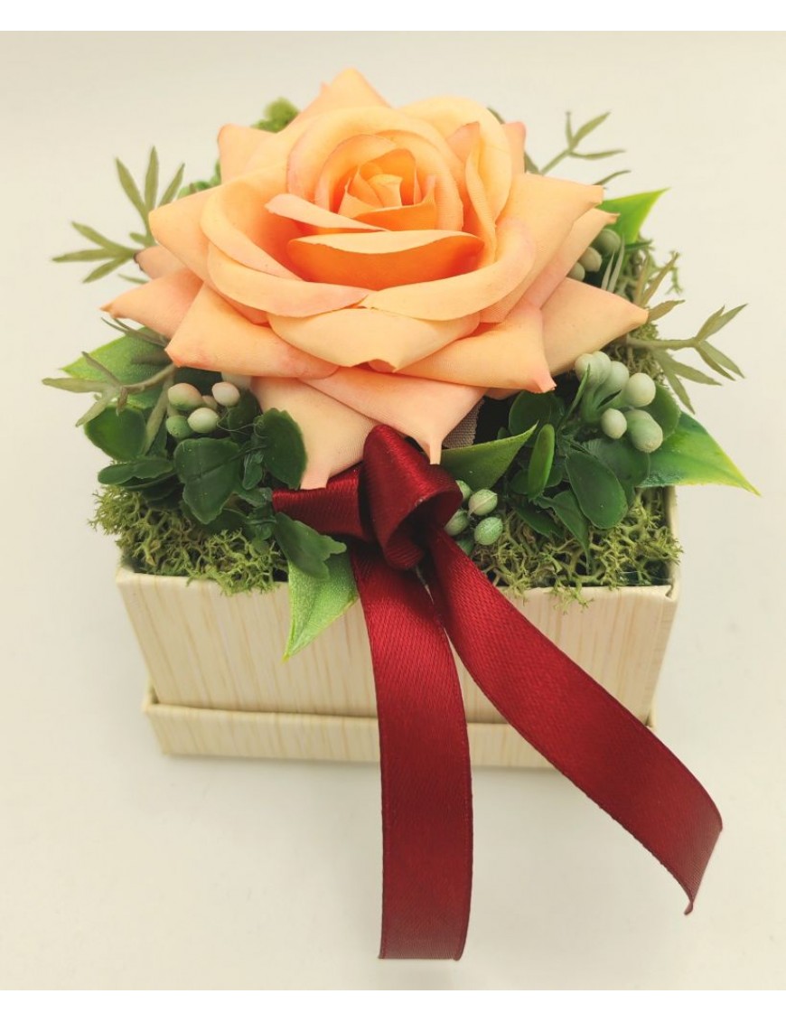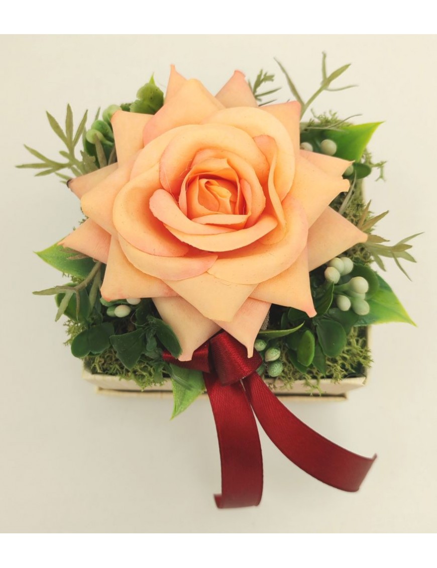 Kicsi papírdoboz barack rózsával díszítve.