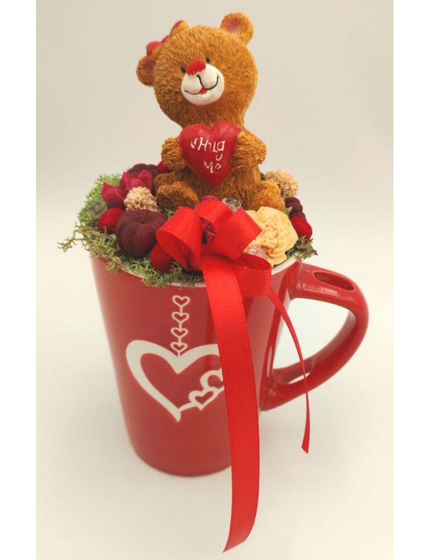 Piros, szív mintás díszített bögre macival.