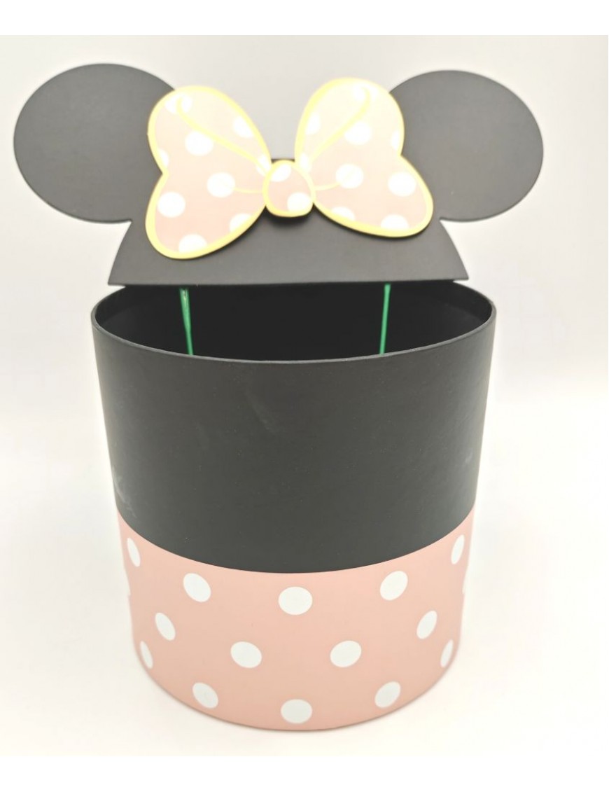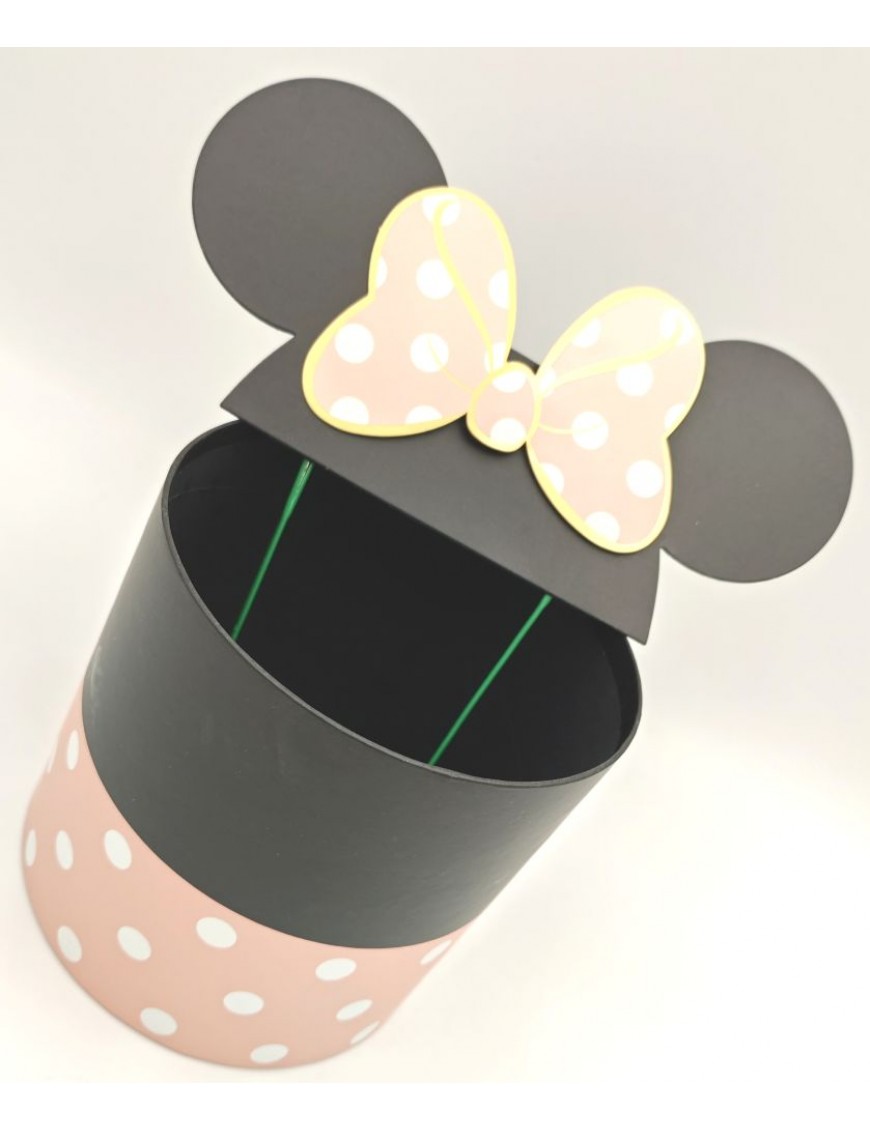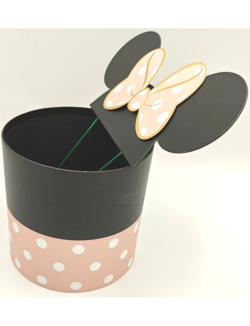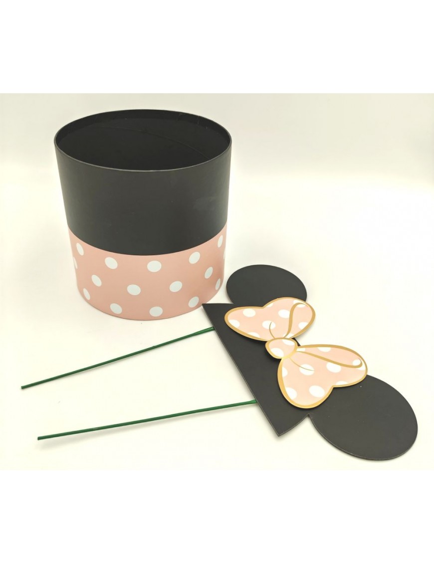 Pöttyös papír doboz beszúrható fülekkel, rózsaszín-fekete színben.