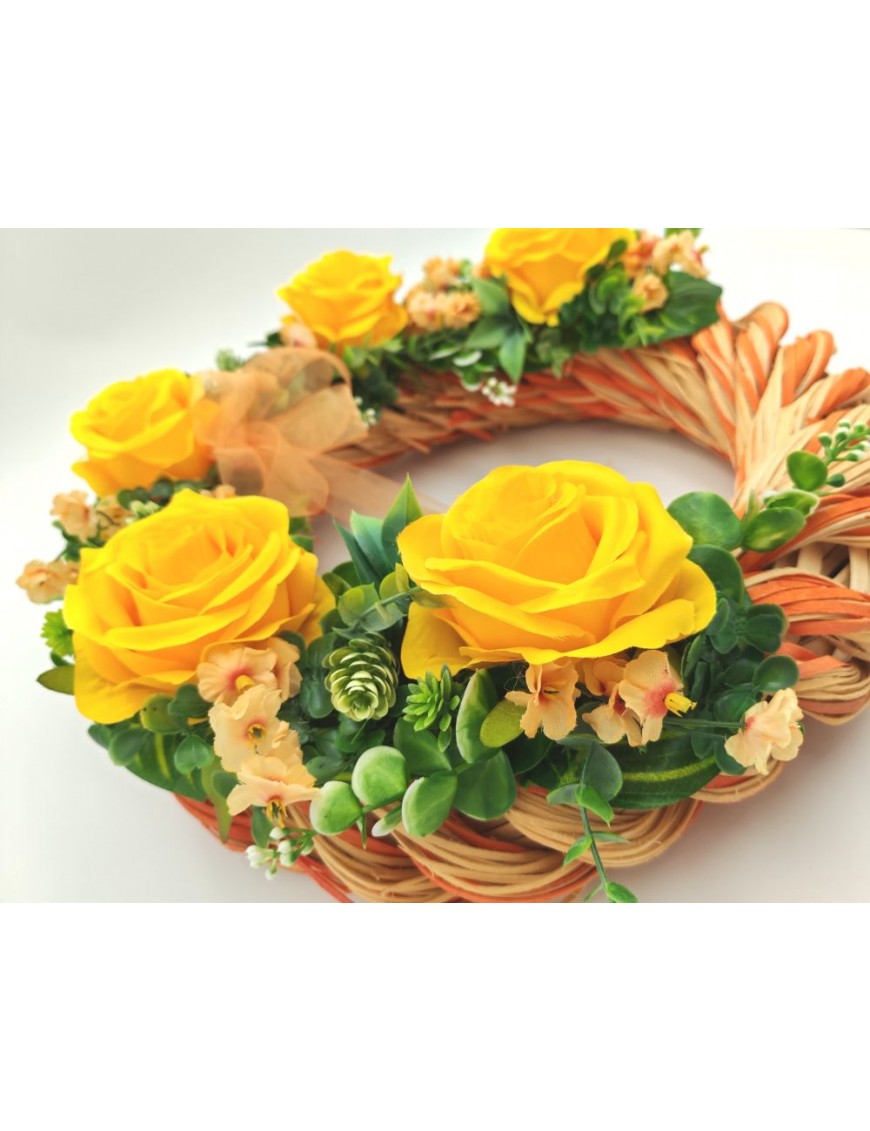 Nagy méretű, narancs-natúr fa alapra készült tavaszi kopogtató sárga rózsával.