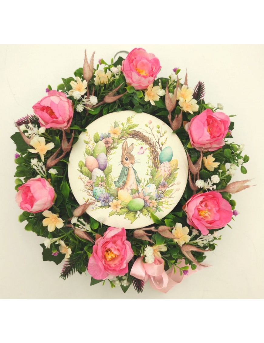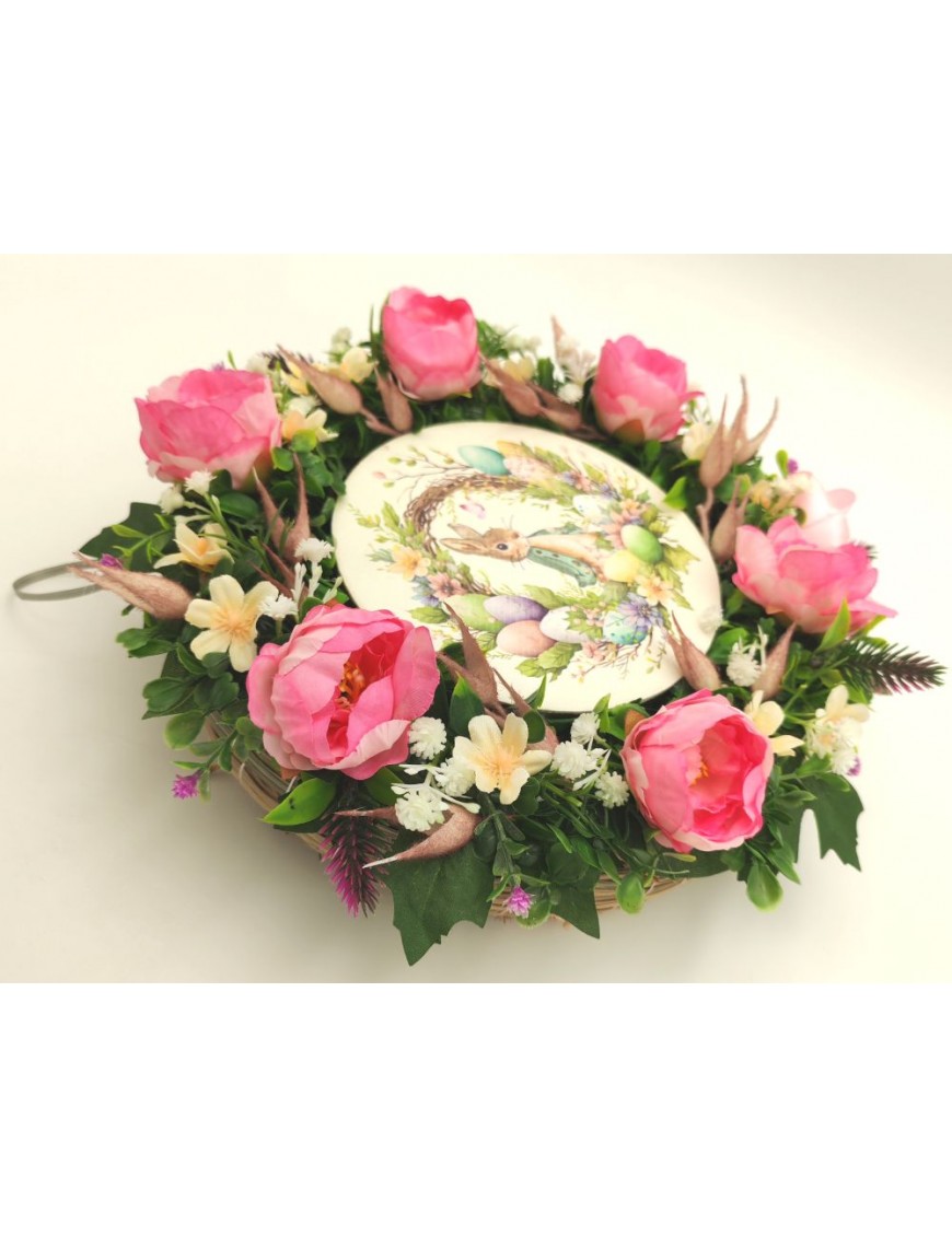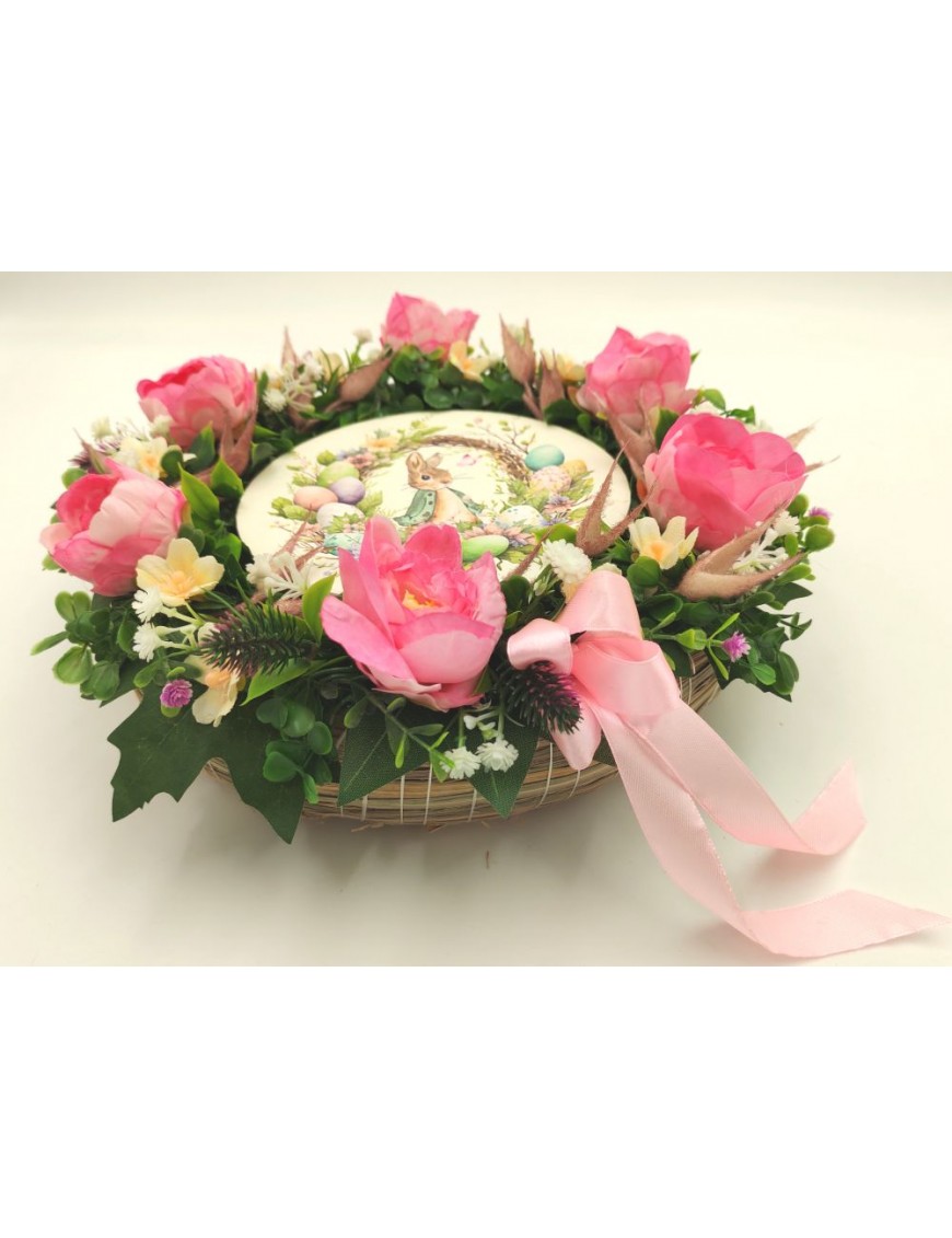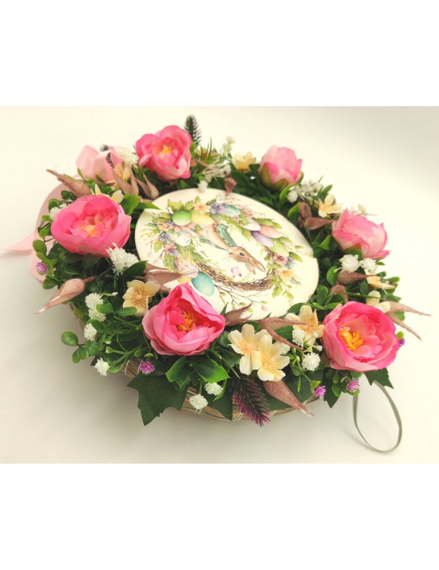 Szalma alapra készült tavaszi kopogtató rózsaszín virágokkal, közepén nyuszis táblával.