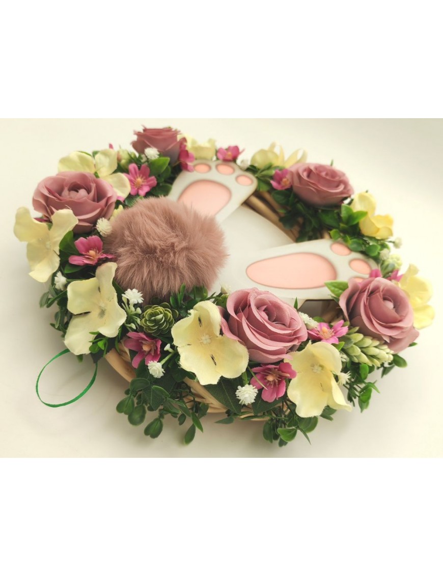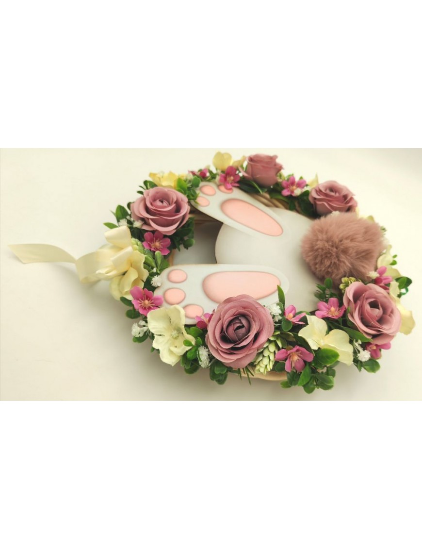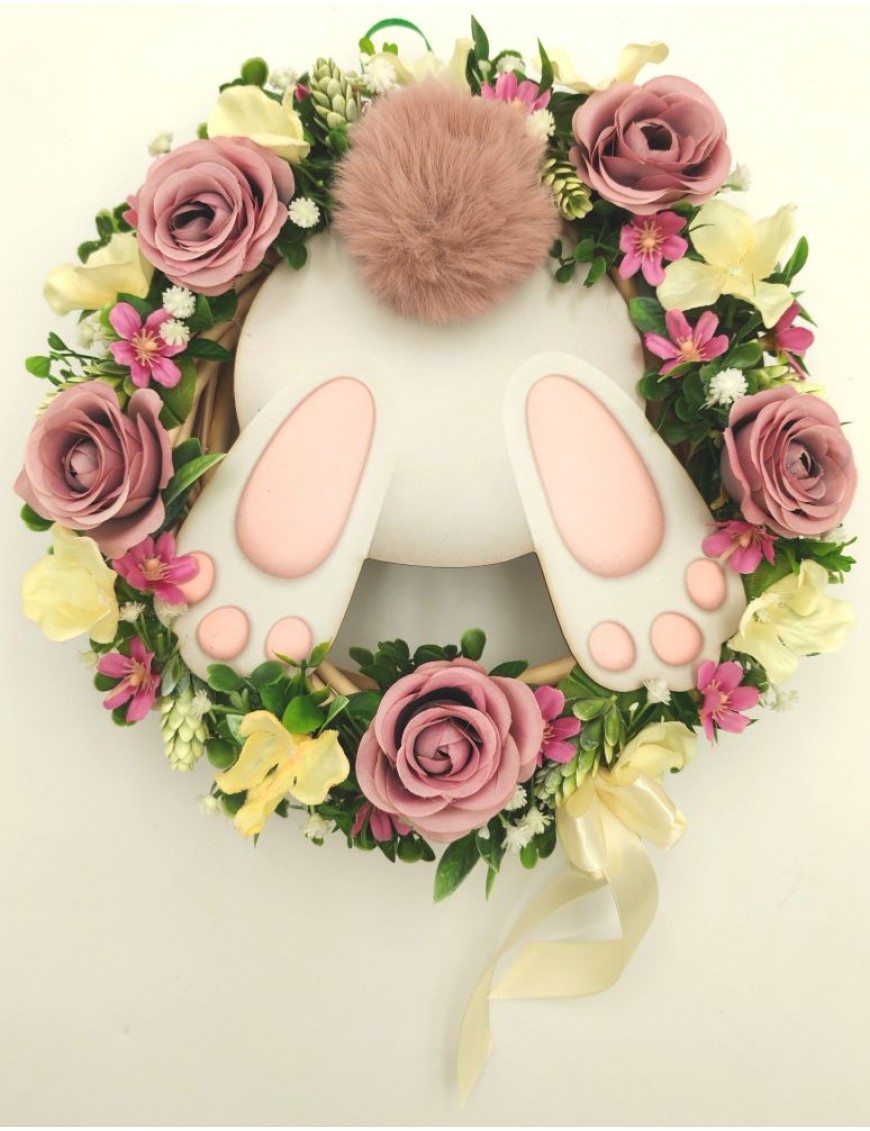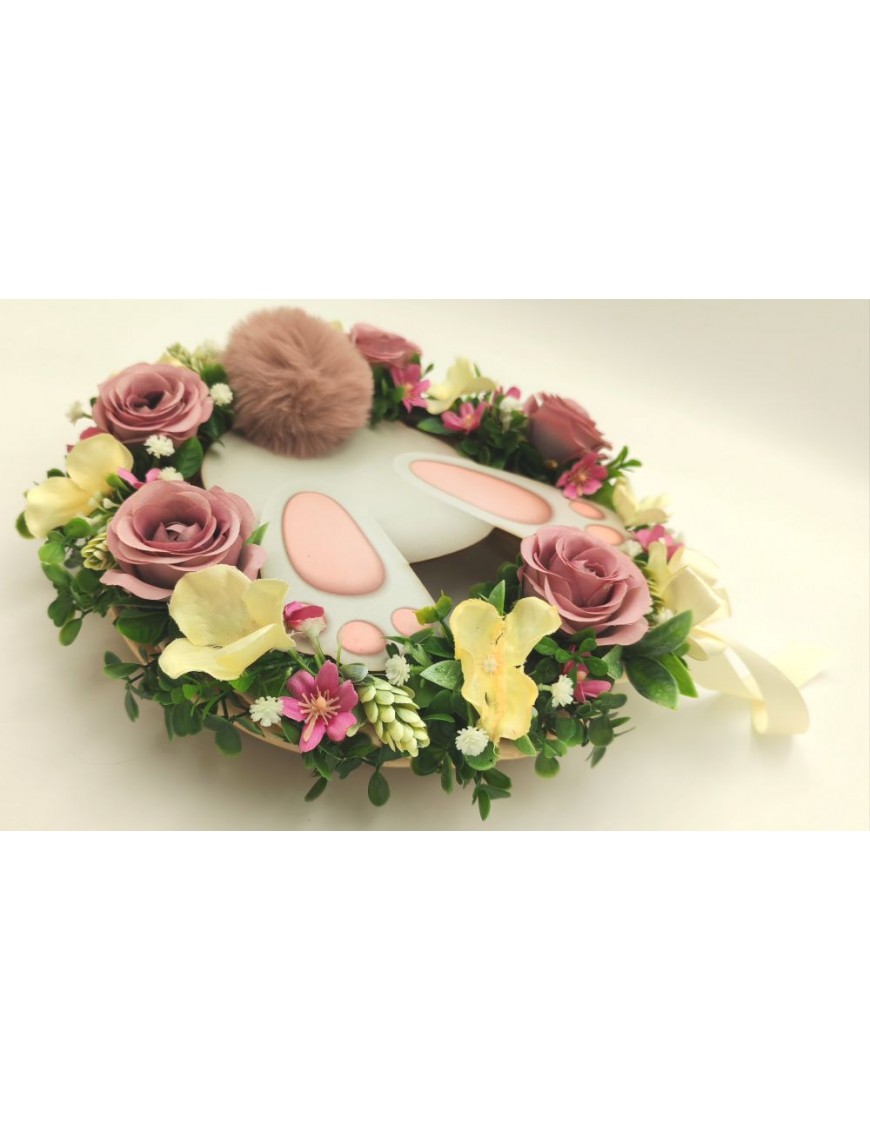 Vessző alapra készült kopogtató nyuszipopó táblával, mályva-krém virágokkal.
