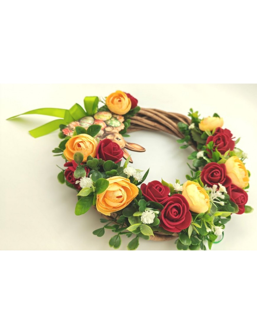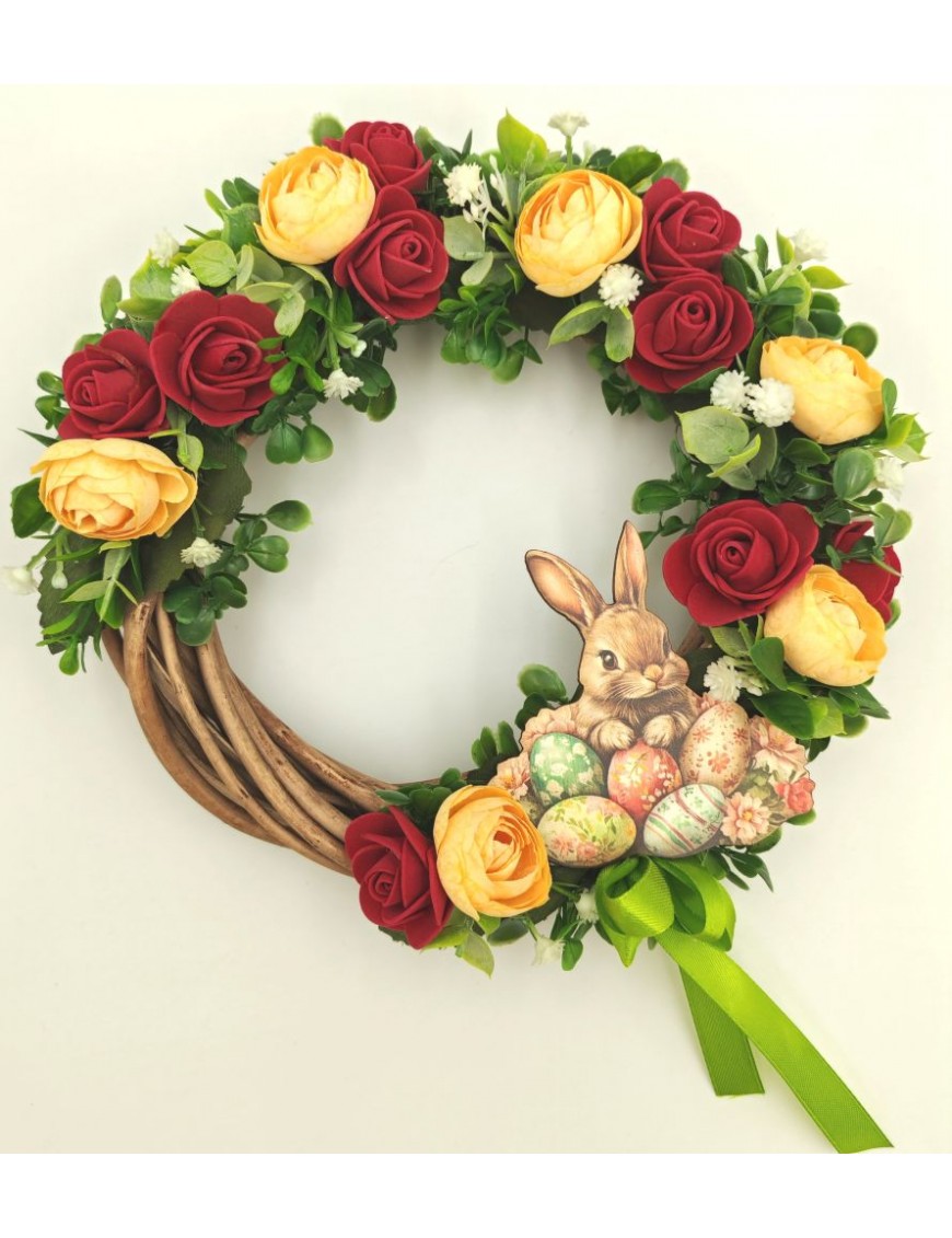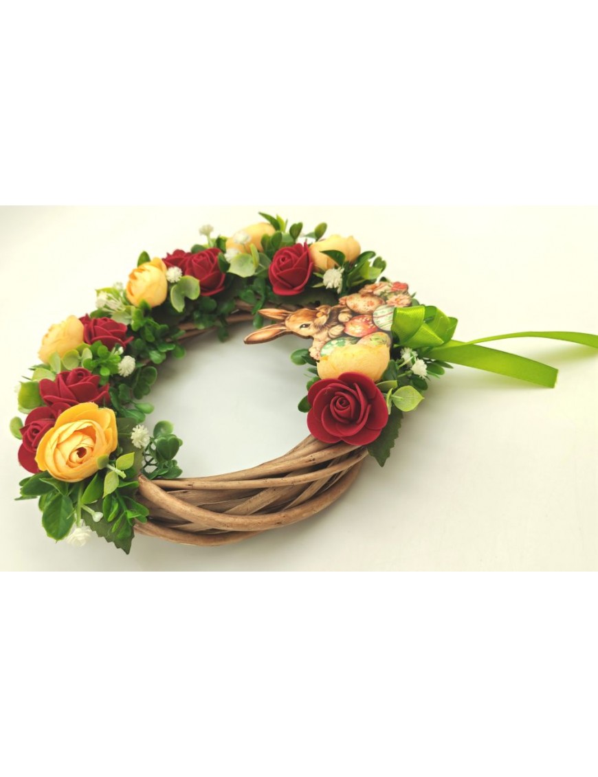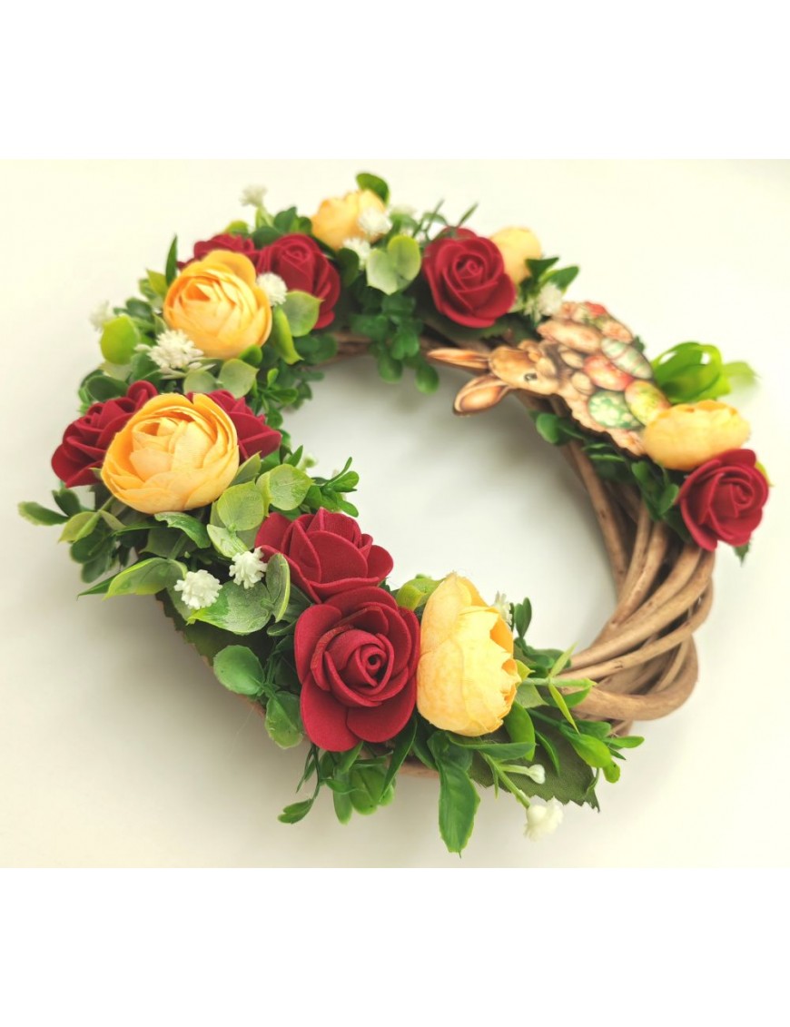 Vessző alapra készült kopogtató bordó-sárga színvilággal, nyuszis táblával.