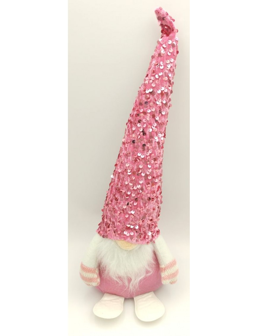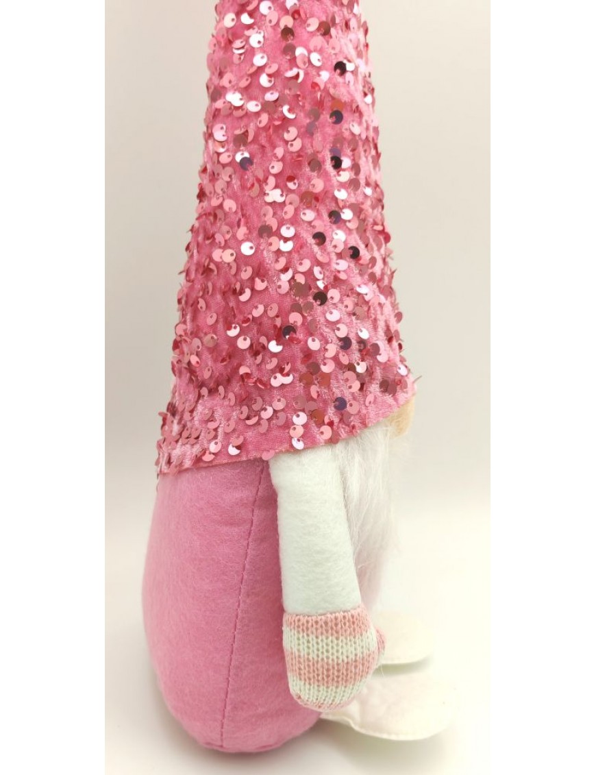45 centiméter magas plüss manó flitteres sapkában, rózsaszín színben.