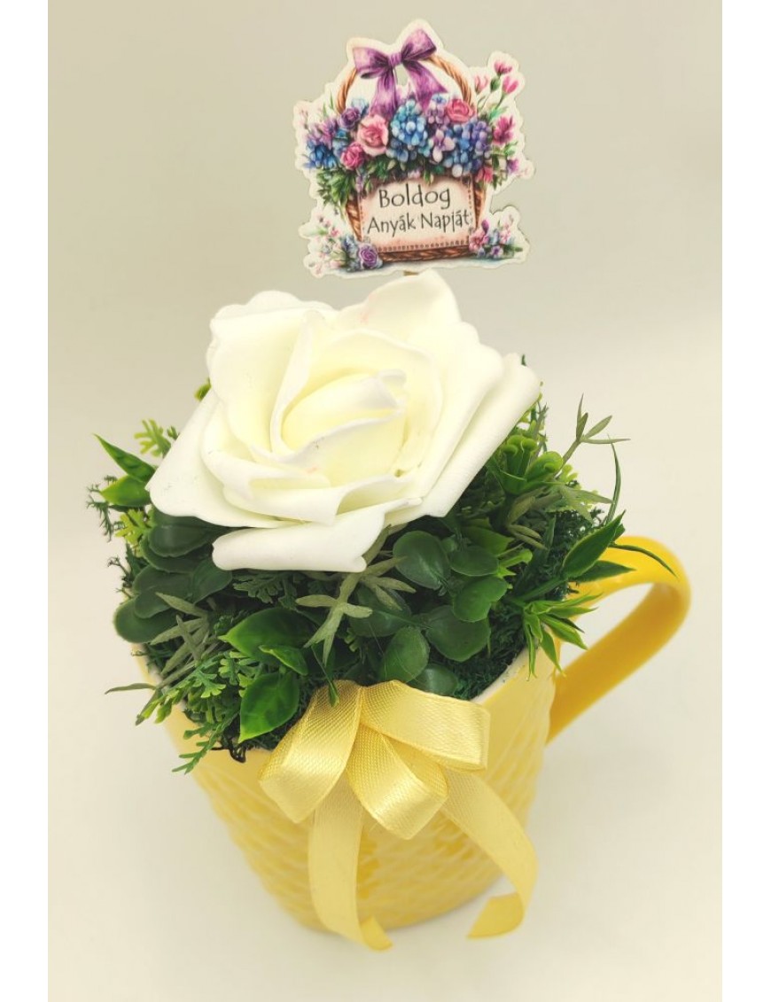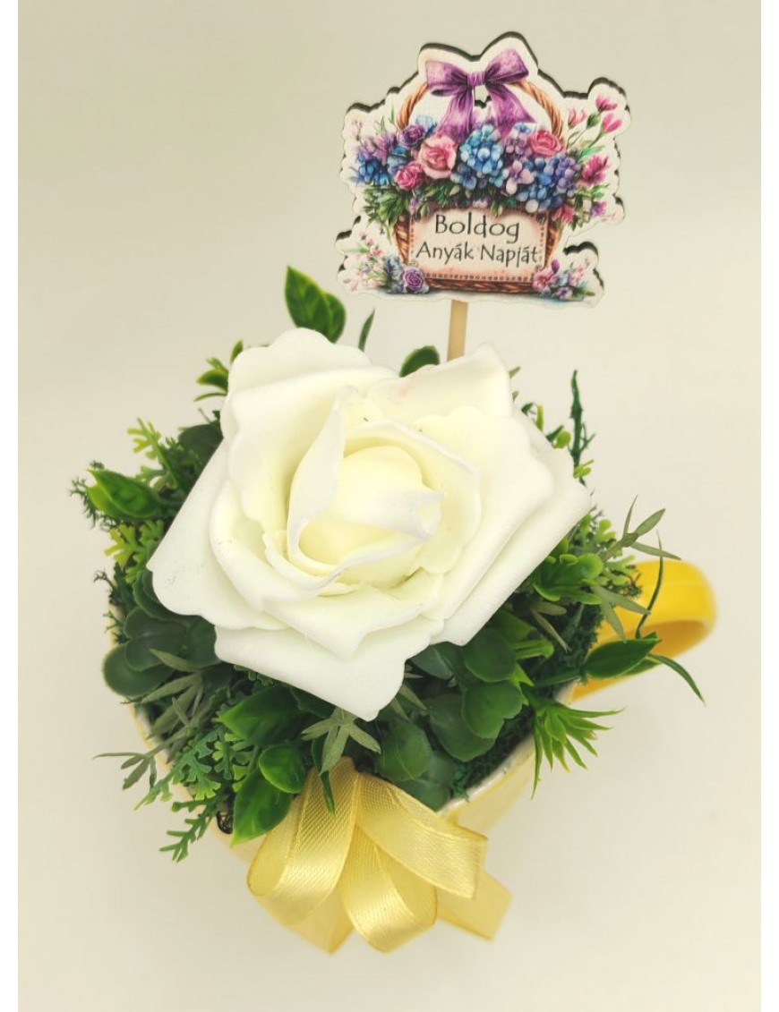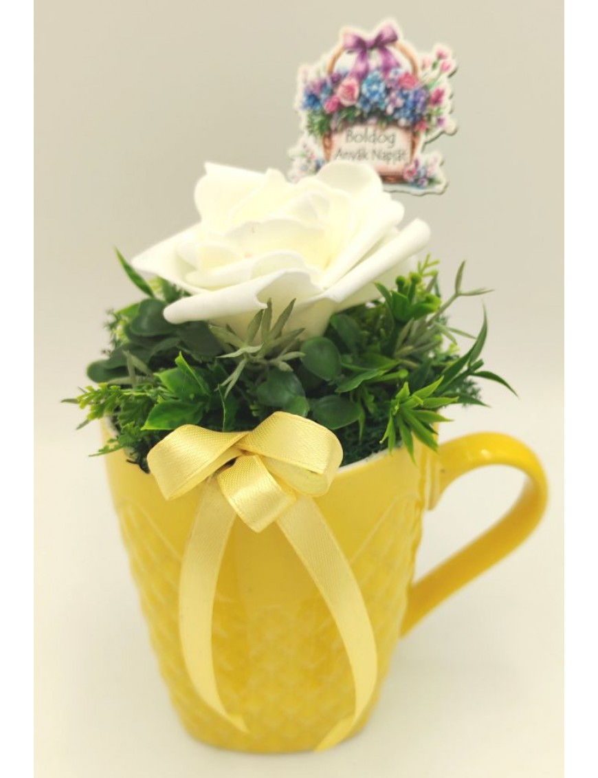 Sárga kerámia bögre fehér színű polifoam rózsával, beszúrós táblával: Boldog Anyák Napját.