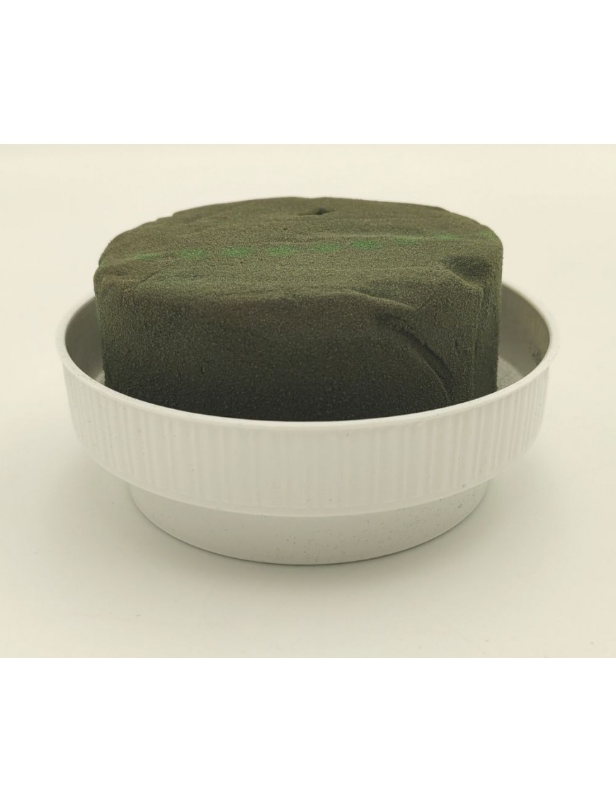 Kerek, fehér műanyag tál vizes oázissal.