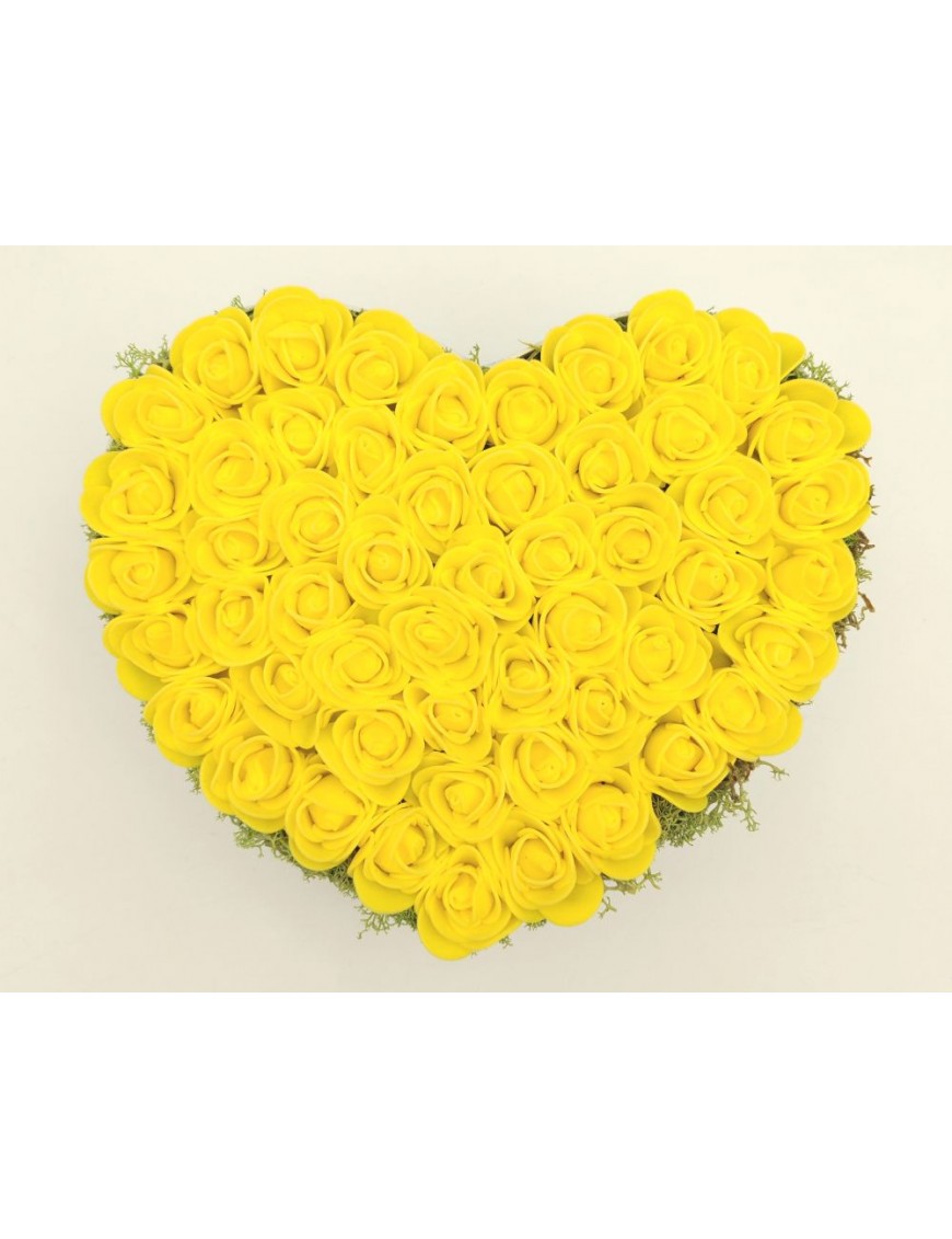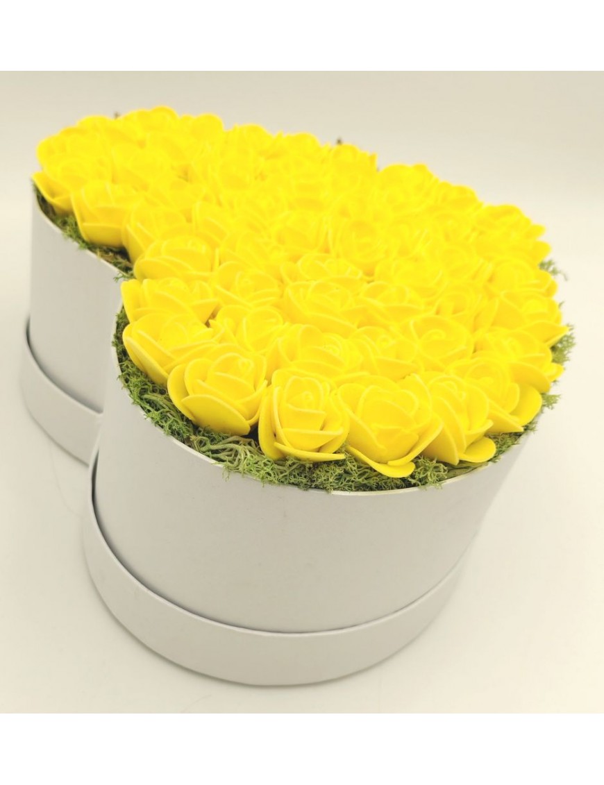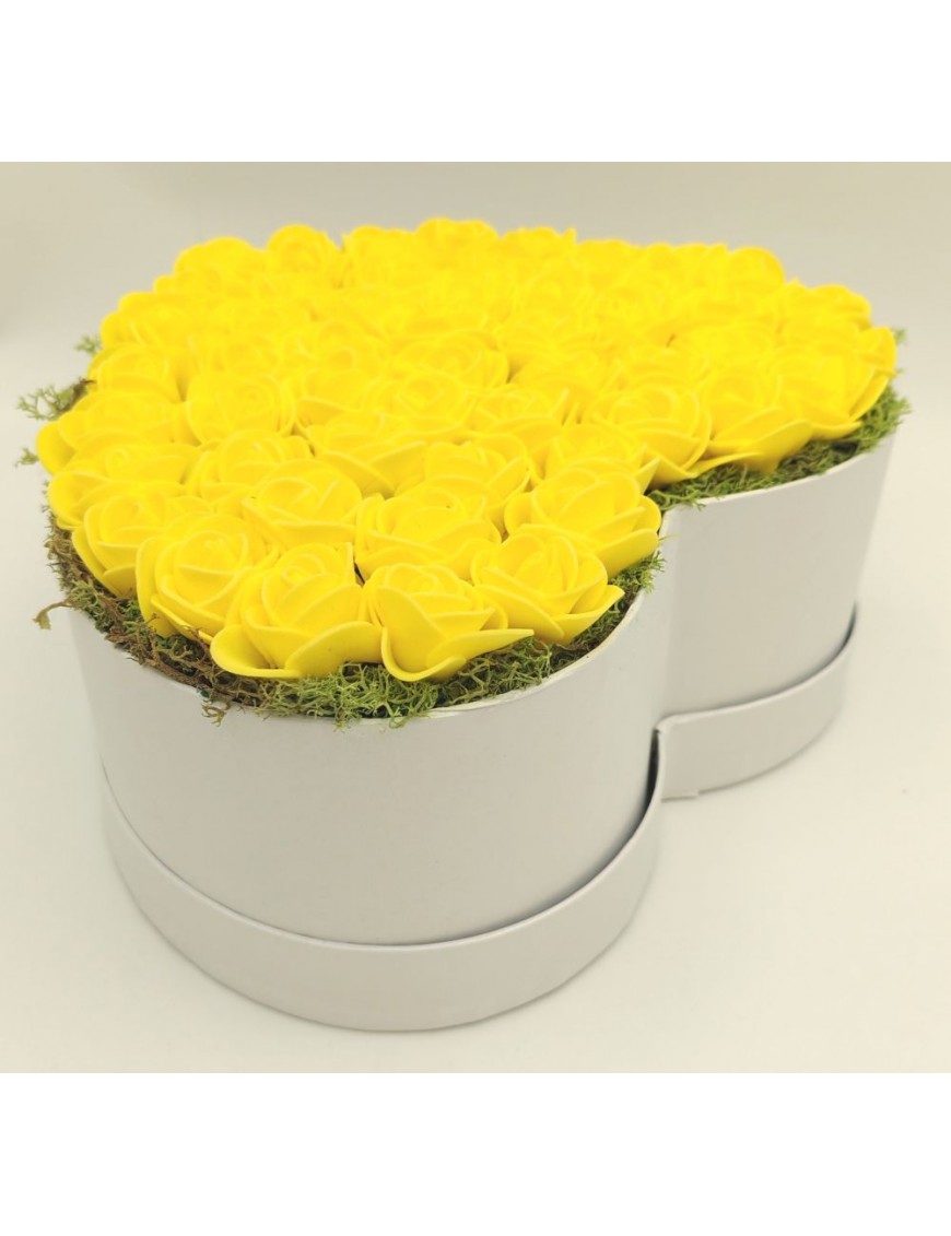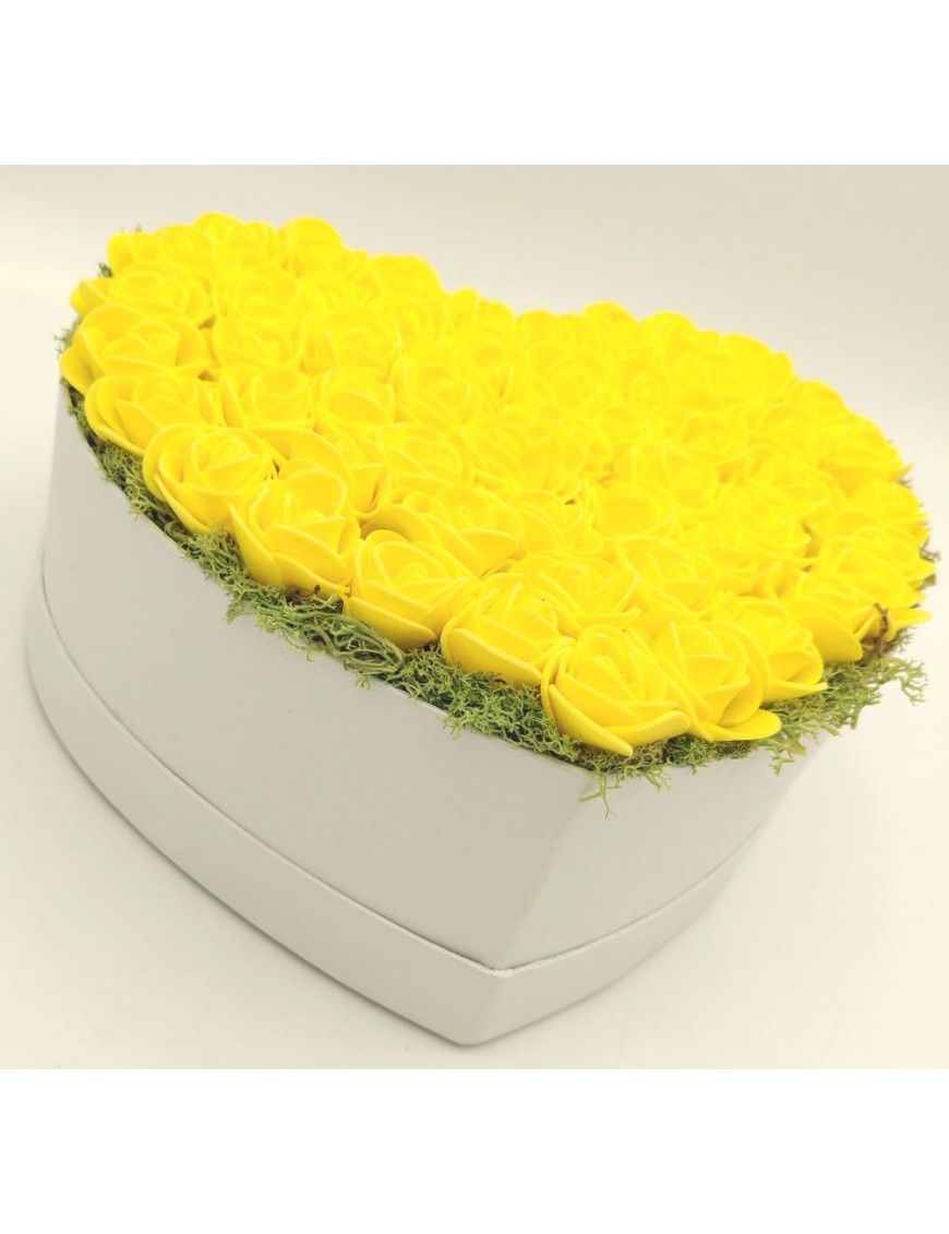 Fehér, szív alakú papírdoboz sárga polifoam rózsákkal.