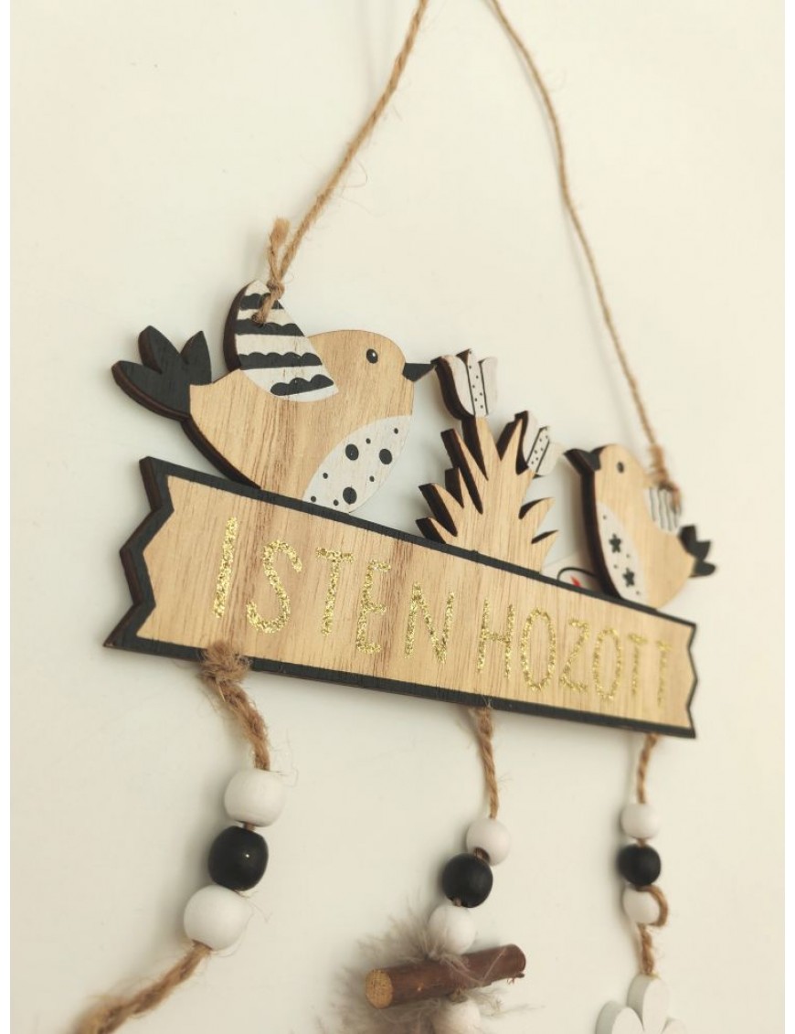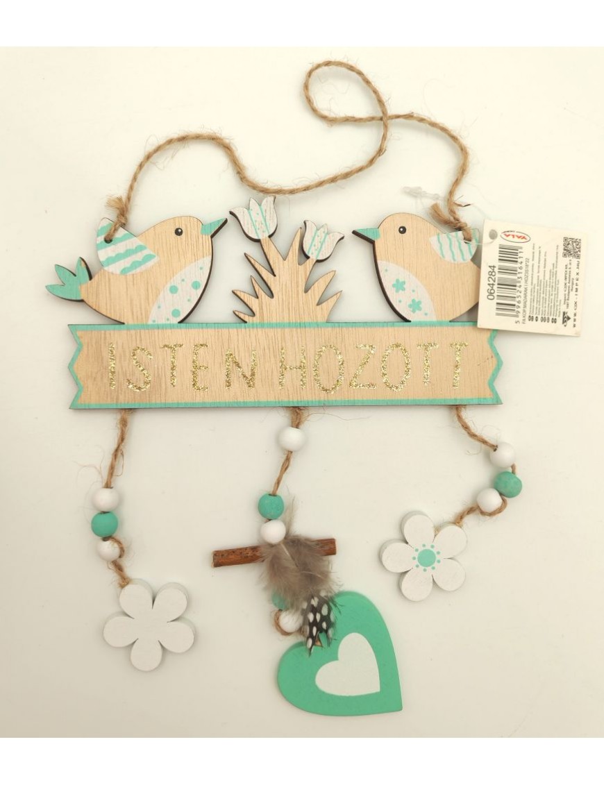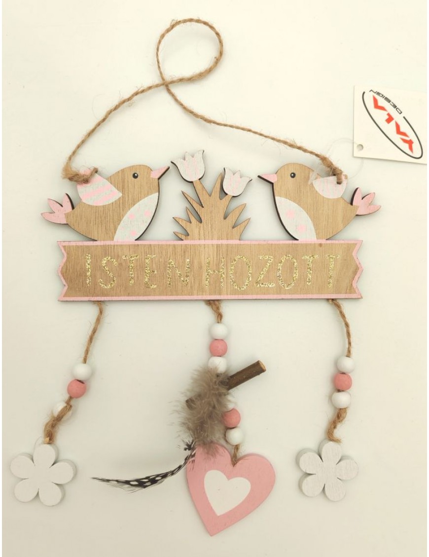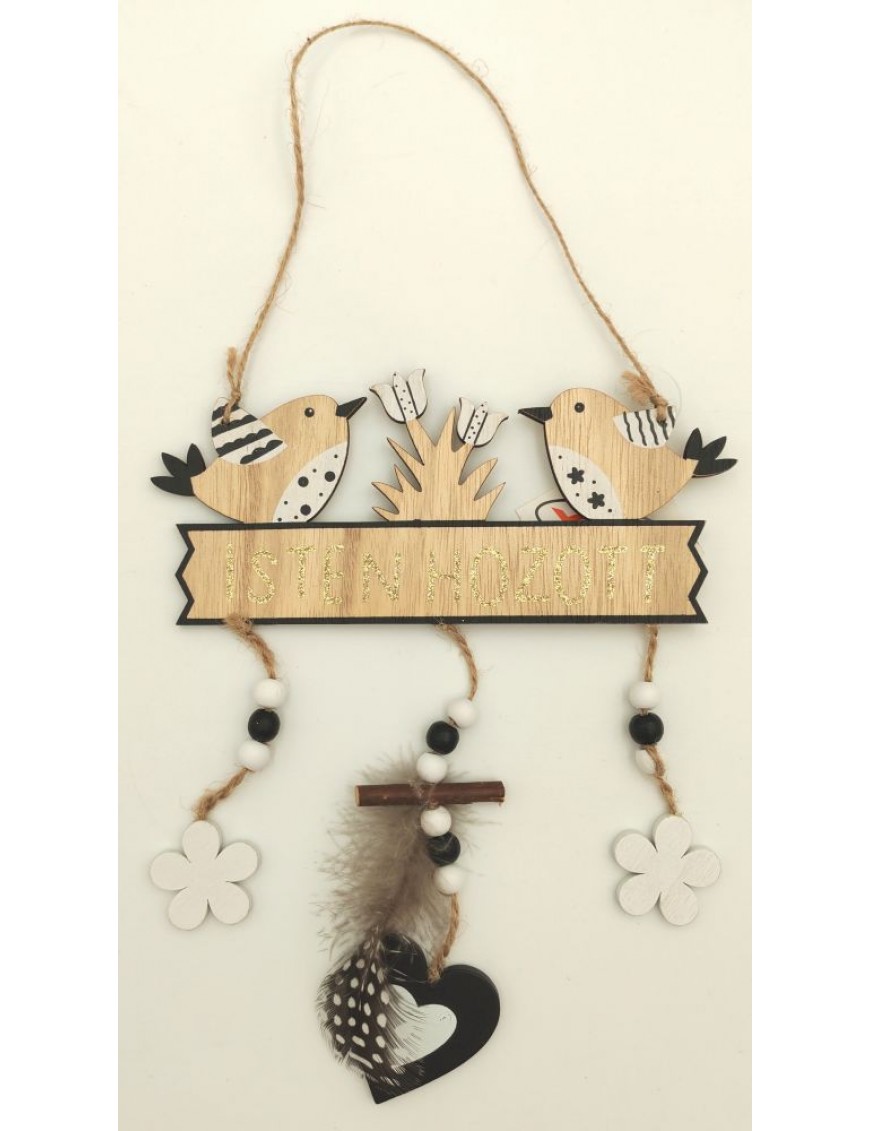 Fából készült, madárkás ajtódísz fekete, rózsaszín vagy türkiz színben, csillogós Isten hozott felirattal.