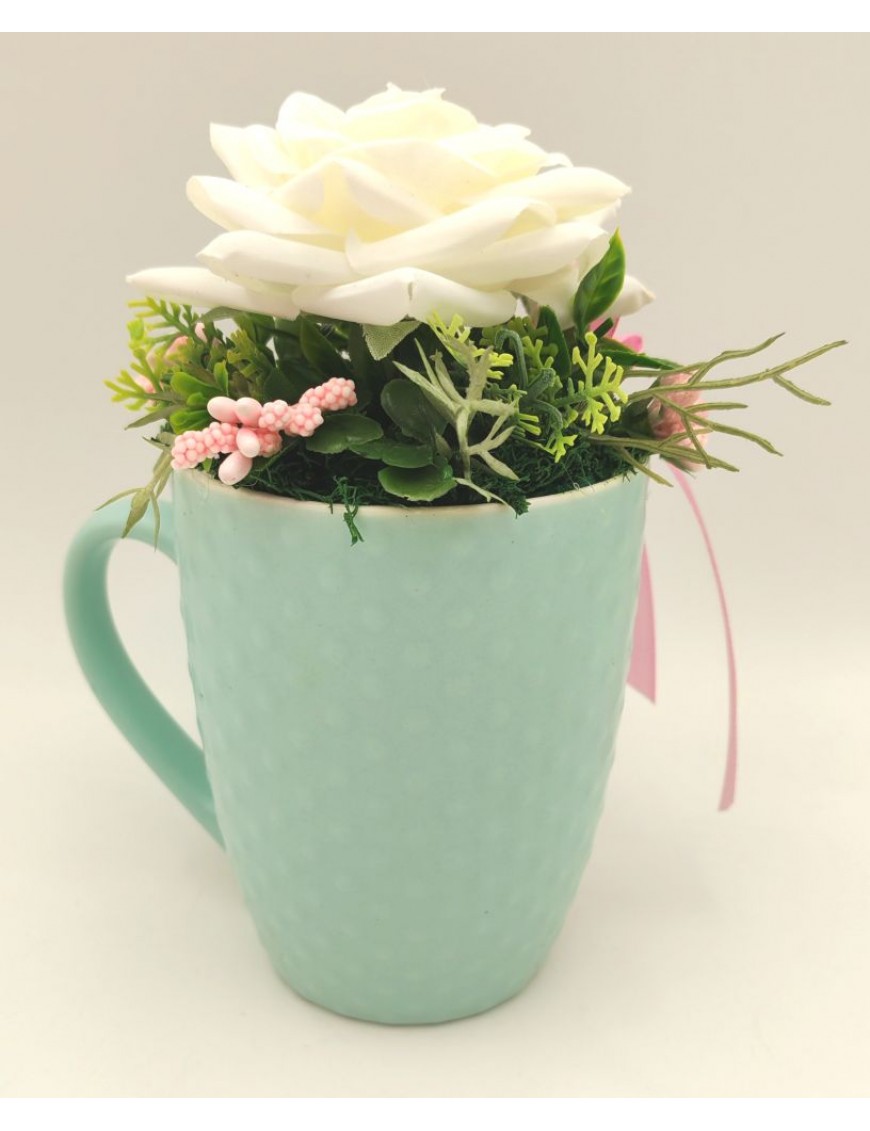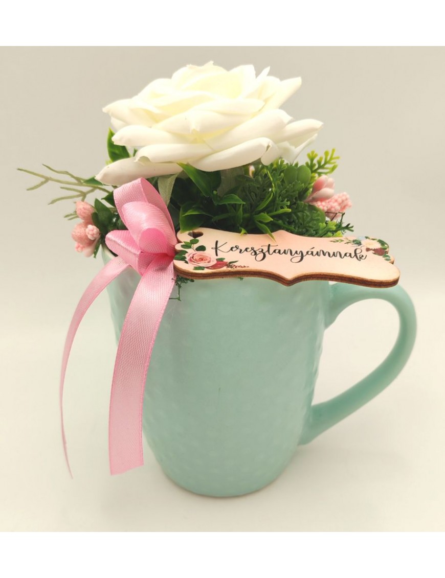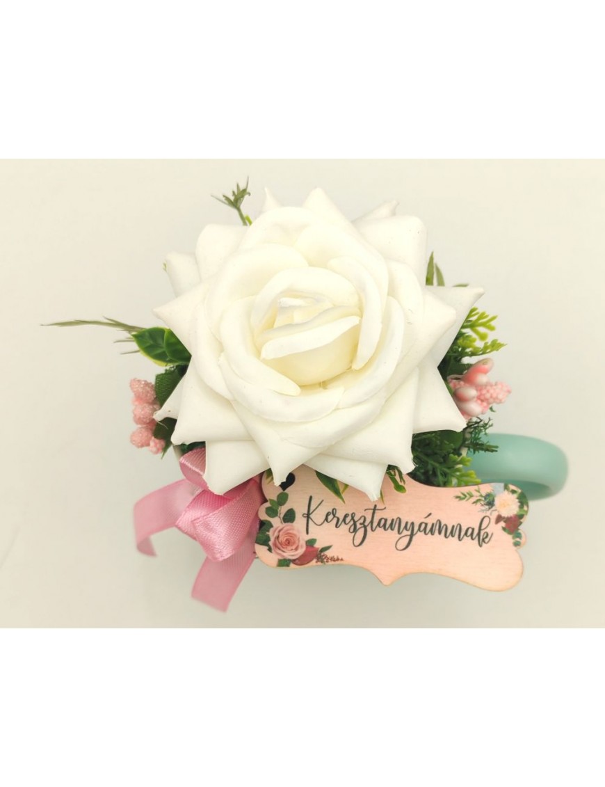 Türkiz színű, fehér rózsával díszített bögre kis fa táblával, Keresztanyámnak felirattal.