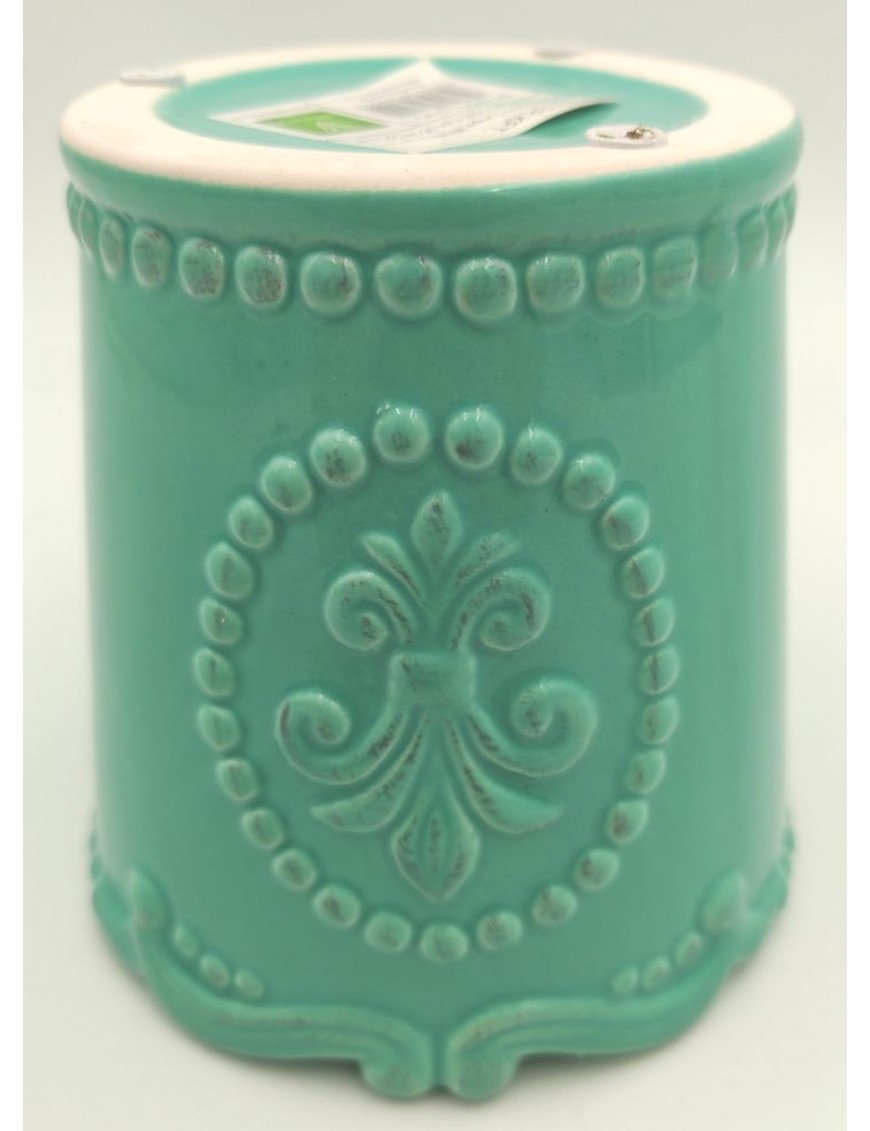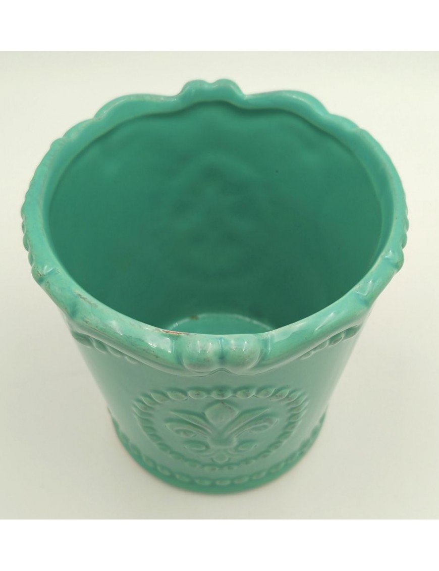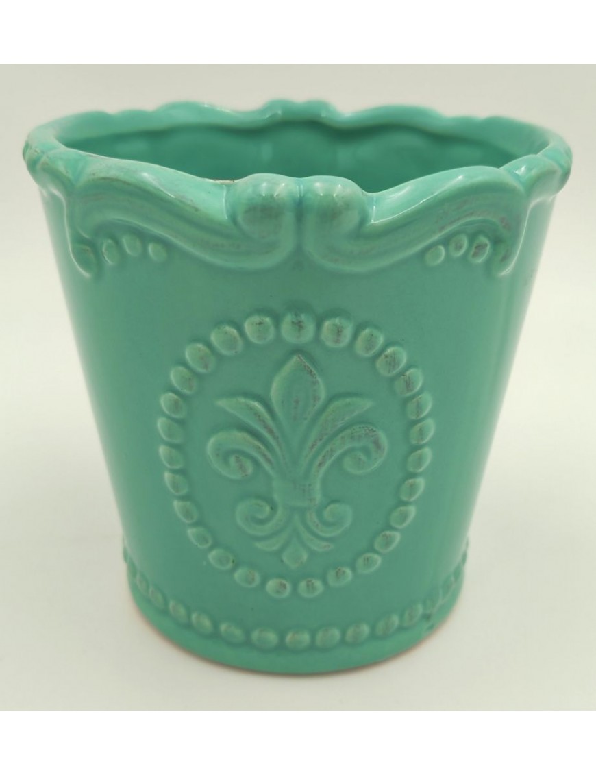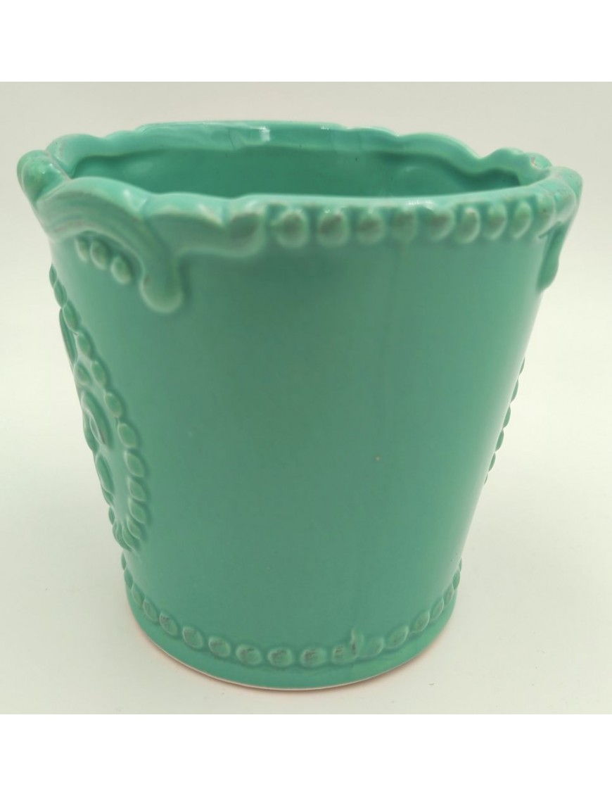 Türkiz színű kerámia kaspó kis mintával.