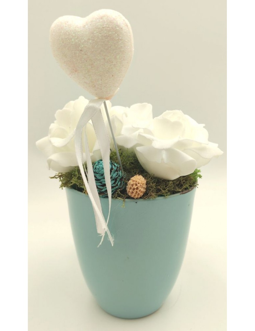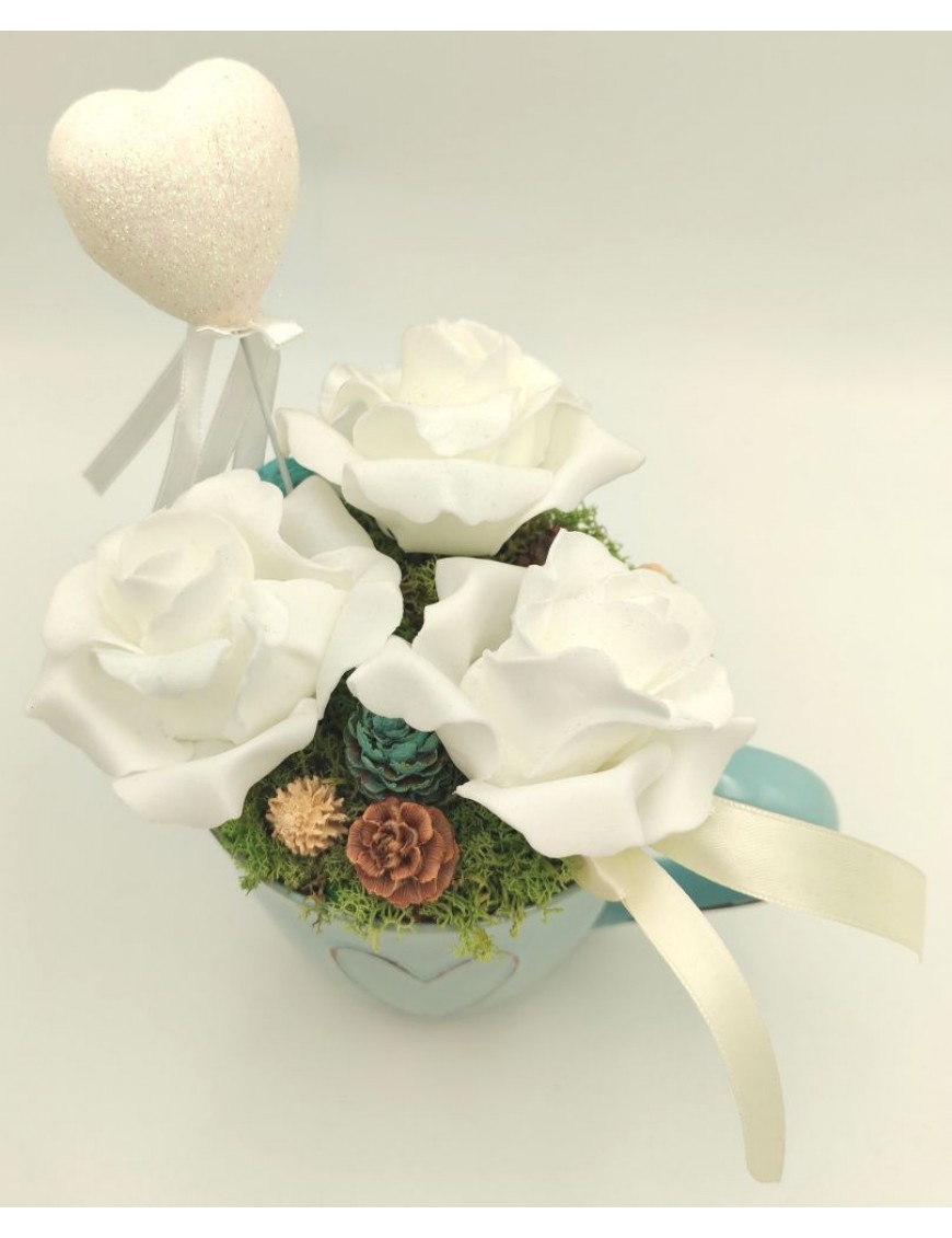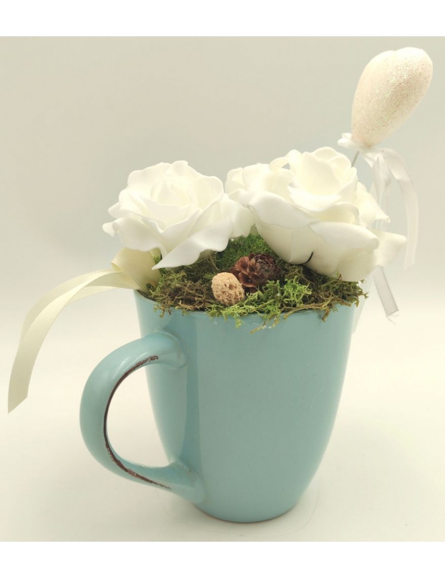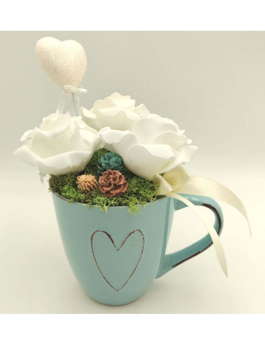 Világoskék, szíves bögre fehér rózsákkal és betűzővel.