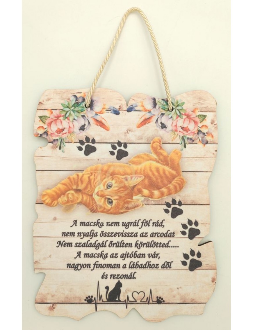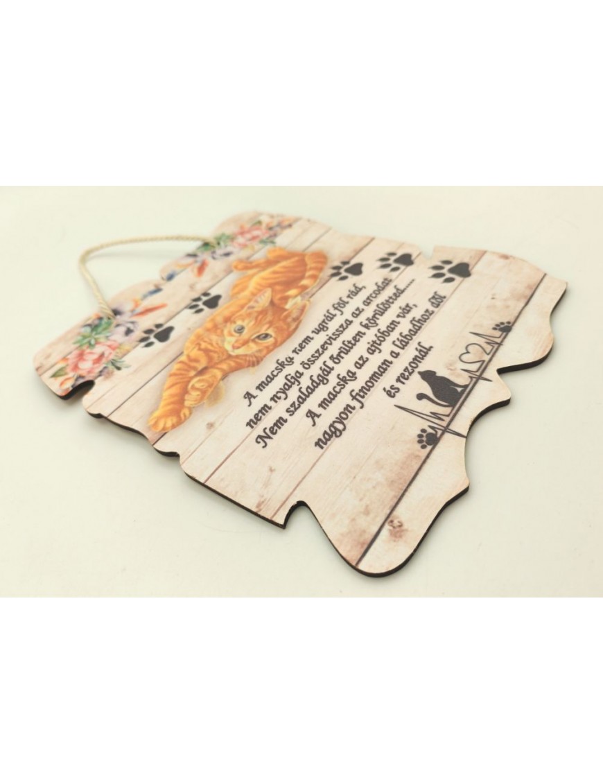 Fából készült, nyomtatott tábla cica mintával, felirattal.